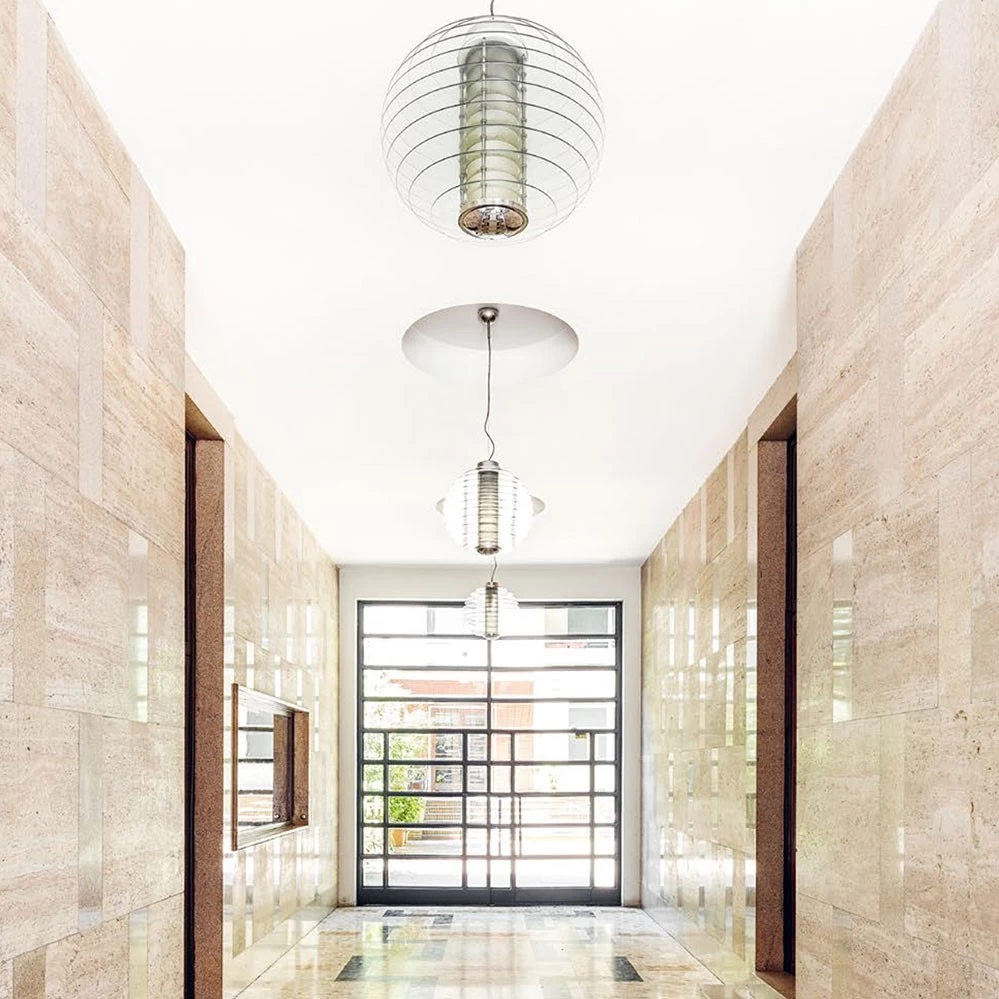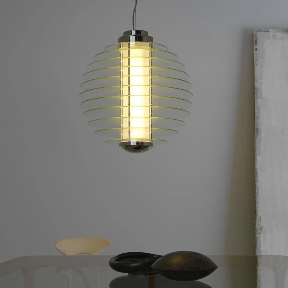 Die Fontana Arte Hängeleuchte 0024 ist ein Entwurf aus dem Jahr 1933 und noch stark vom damaligen Art Déco beeinflusst. Der Entwurf stammt von Gio Ponti, er war zusammen mit Pietro Chiesa Mitbegründer von Fontana Arte. Zusätzlich ist die Leuchte 0024 noch als größeres Modell mit 141 cm Durchmesser auf Anfrage bei Fontana Arte erhältlich.