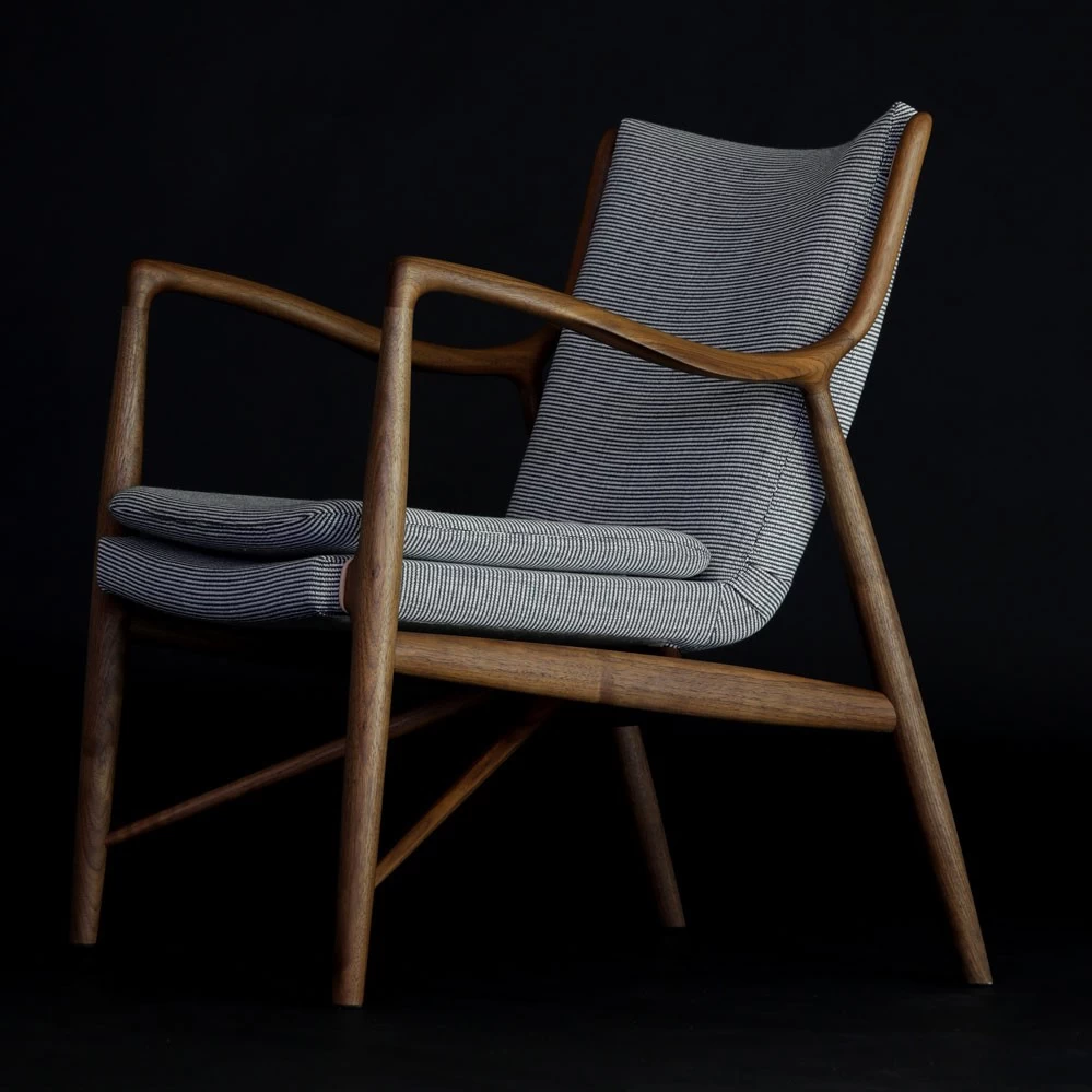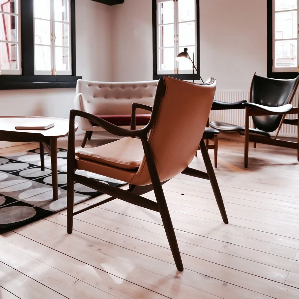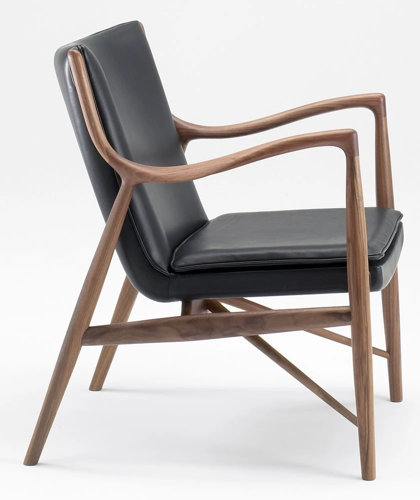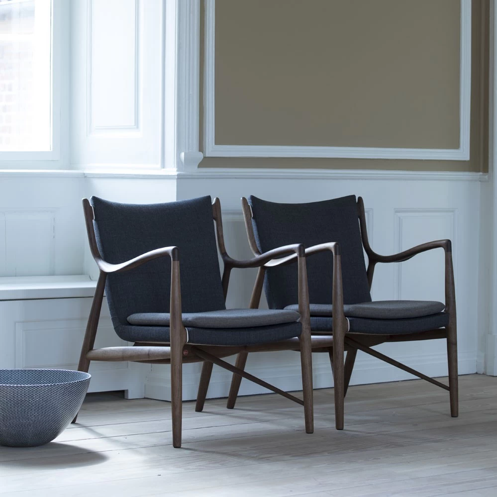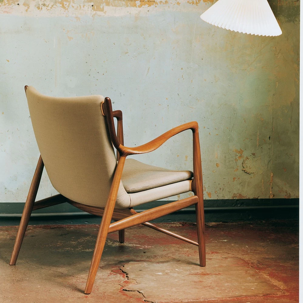 Einer unserer Lieblingsentwürfe von Finn Juhl ist der Stuhl oder Sessel 45 (natürlich nach dem Jahr 1945). Denn das Design des 45 Chair mit seiner eleganten Silhouette ist ein Meisterwerk und ein weiteres Symbol für das Genie von Finn Juhl. Der Sessel wurde erstmalig 1945 auf der Kopenhagener Cabinetmaker’s Guild Exhibition vorgestellt und vom japanischen Professor und Vorsitzenden-Experten Noritsugu Oda als „Mutter aller modernen Stühle” bezeichnet. Der Raum zwischen Rahmen und Sitzfläche schafft eine Leichtigkeit, die in Kombination mit ihrer organischen Form und den Details eine einzigartige Schönheit bilden. Dieser Stuhl war einer der ersten, der sich der Tradition der Sesselformgebung entledigte, indem er die Polsterbereiche aus dem Holzrahmen befreite. Geeignet ist der 45 Chair mit seiner Sitzhöhe von 42 cm wahlweise als Sessel wie auch als niedriger Stuhl.