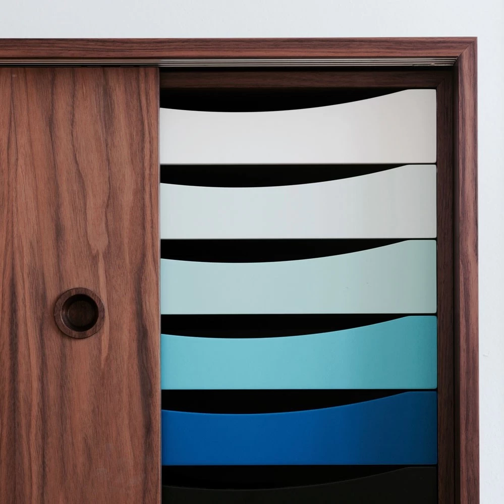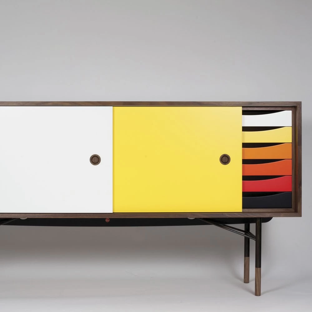 Finn Juhls schlichtes Sideboard aus dem Jahr 1955 kombiniert exklusive Materialien mit den Farben von Goethes Farbkreis. Das Sideboard wird bei House of Finn Juhl mit einem furnierten Korpus aus Teak, Eiche oder Nussbaum gefertigt. Die beiden Schiebetüren sind wahlweise Weiß / Gelb oder Weiß / Hellblau lackiert. Passend dazu enthält das Sideboard sechs innenliegende Schubladen, die Goethes Farbkreis nochmals aufgreifen. Das Stahlgestell mit Holzfüßen ist schwarz, orange oder hellblau lackiert.