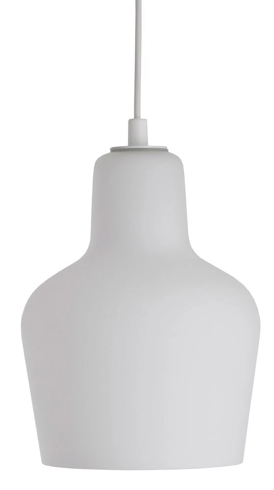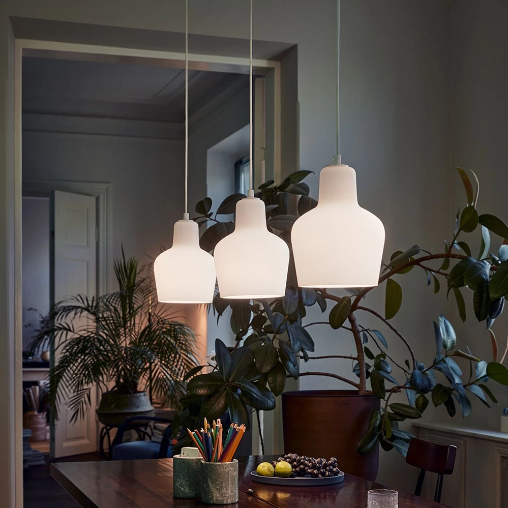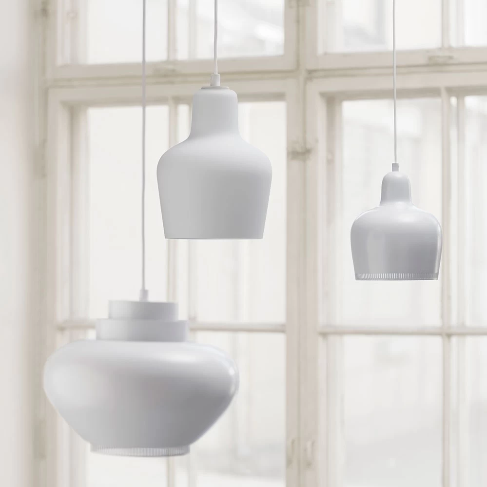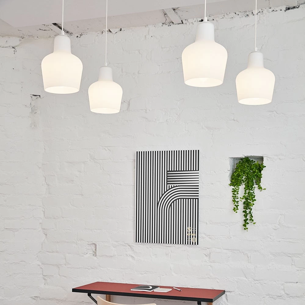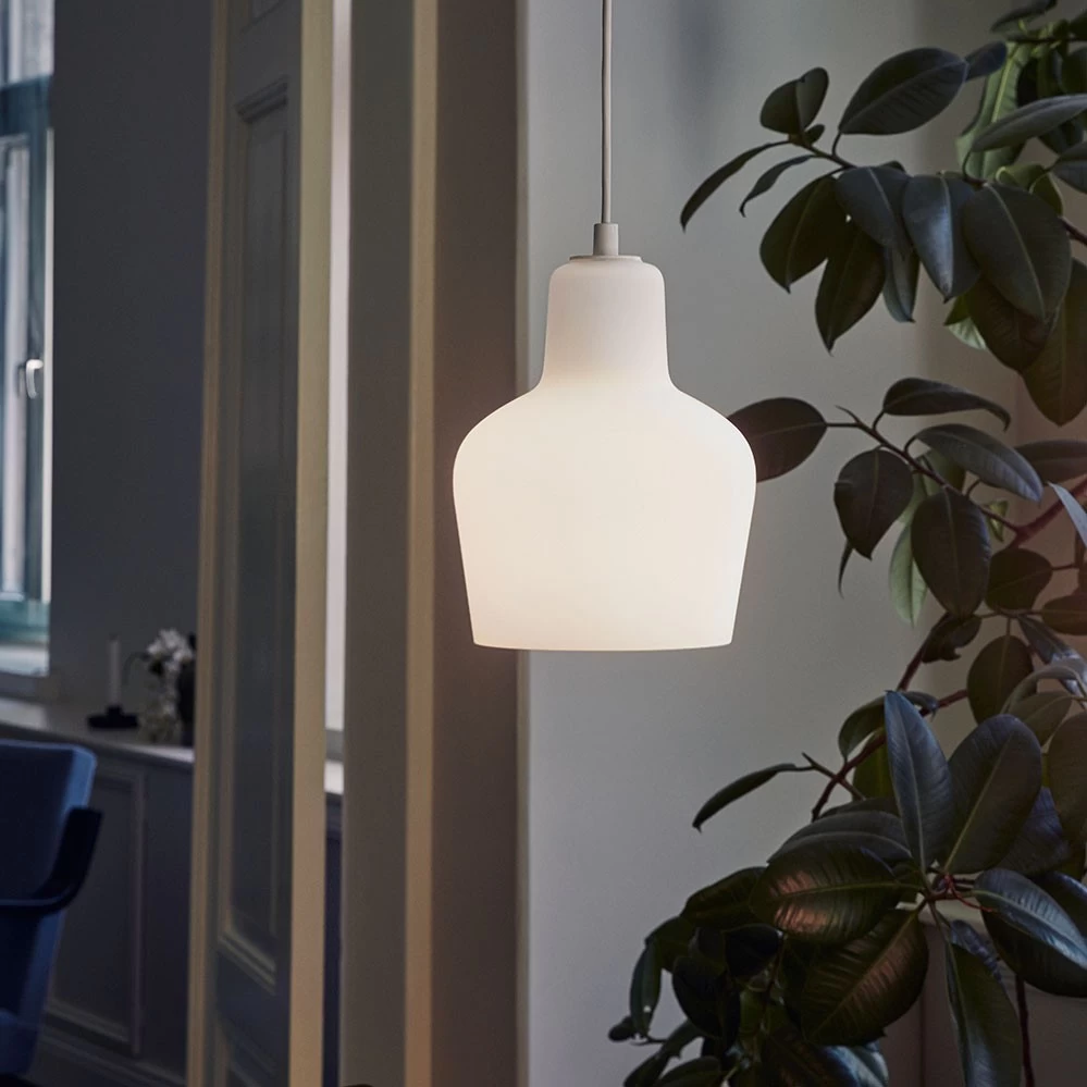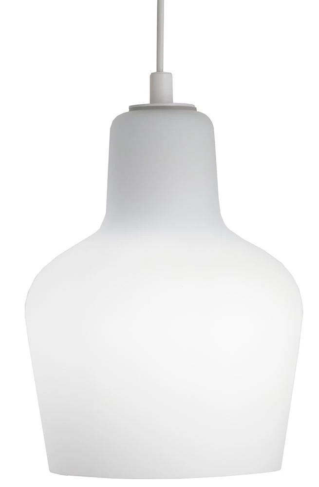Die klassische Pendelleuchte aus mundgeblasenem Opalglas entwarf Alvar Aalto im Jahr 1954.