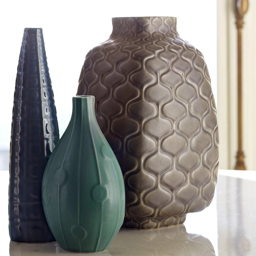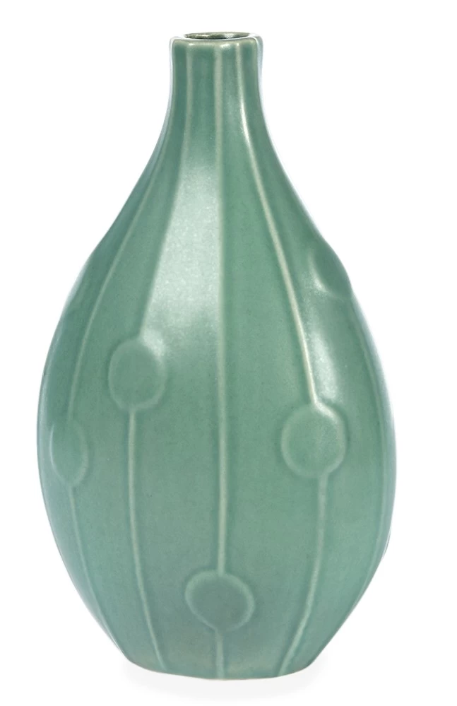 Die türkisfarbige Abacus Vase zählt zu der Relief Collection von Jonathan Adler, eine der ersten Keramikserien des New Yorker Designers. Die Serie zitiert Elemente der dänischen Keramik der 1950er Jahre. Gedacht ist es, verschiedene Vasen der Serie miteinander zu kombinieren.