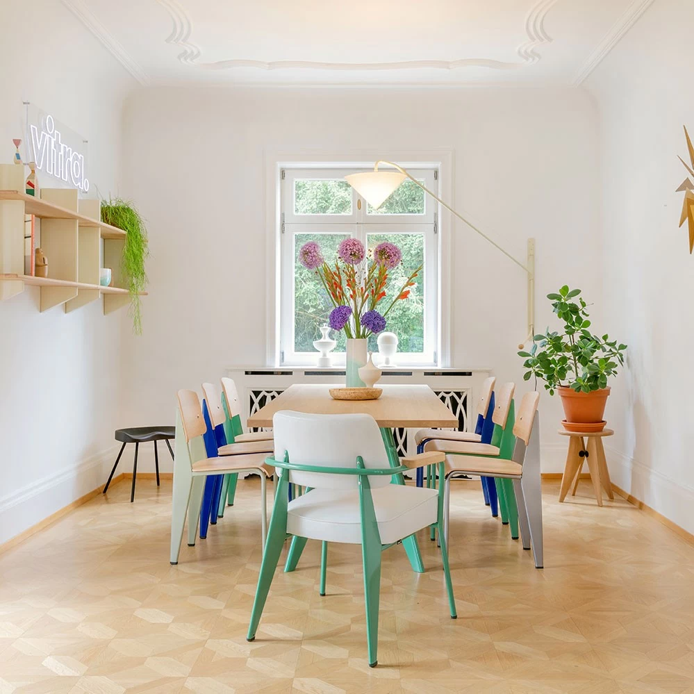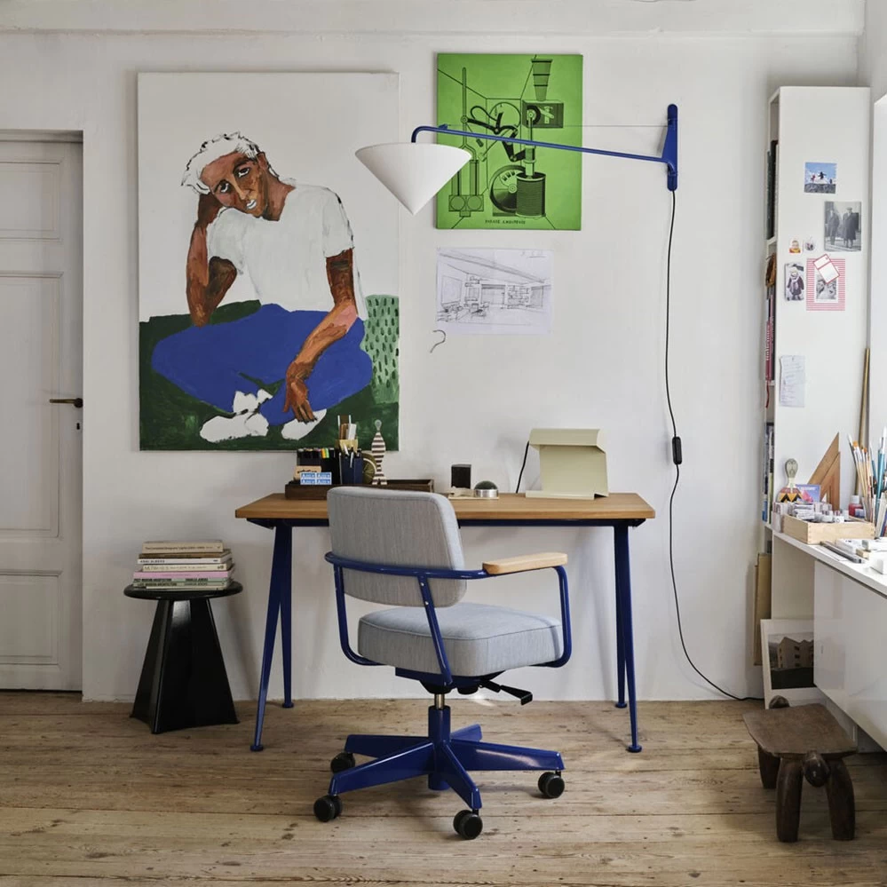 Schöner sind die Potence Leuchten von Jean Prouvé nach unserer Meinung in der Variante nur mit dem nackten Leuchtmittel. Da aber viele Kunden eine indirekte Beleuchtung vorziehen, hat Vitra 2022 einen passenden Leuchtenschirm für die Potence und Mini Potence aufgelegt. Diese Version stammt dabei von Jean Prouvé selbst, er verwendete den kegelförmigen Schirm für sein Haus in Nancy im Jahr 1947 (sowie noch bei anderen Objekten und in anderen Ausführungen).
