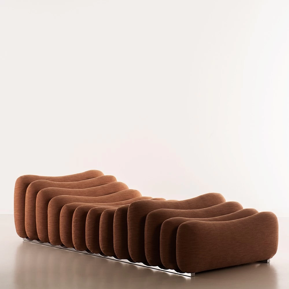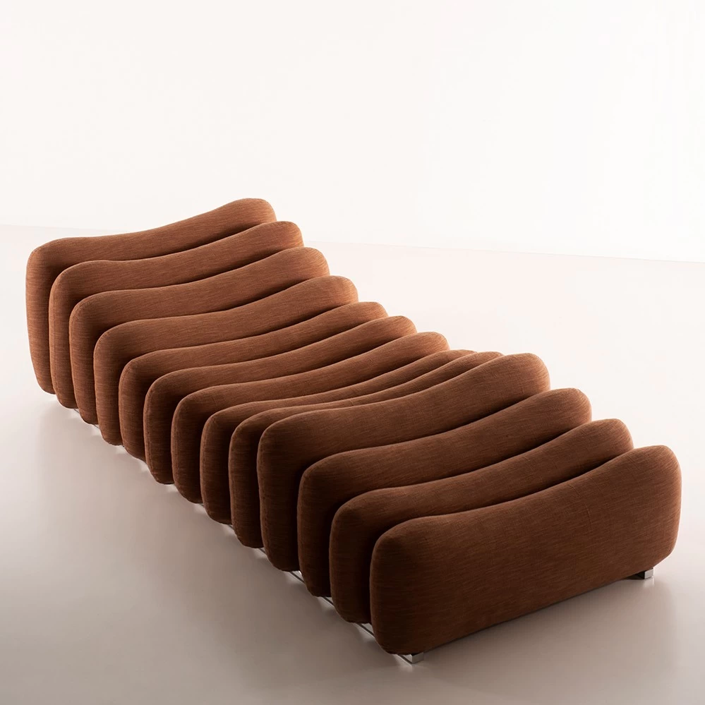 Der ungewöhnliche Daybed zählt zu dem Additional Living System von Joe Colombo. Der Entwurf entstand zwischen 1967 und 1968 für Sormani und zeichnet sich dadurch aus, dass die gepolsterten Einzelelemente mit Klammern an der Metallbasis unterschiedlich zusammengesteckt werden können. 2024 wurde das Additional Living System von Tacchini wieder aufgelegt, bestehend aus Sessel, Pouf und Daybed.
