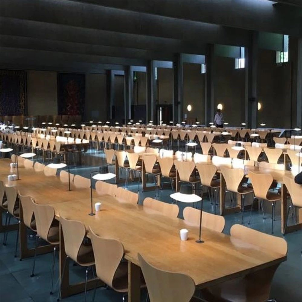 Ab Anfang der 1960er Jahre plante Arne Jacobsen das St. Catherine’s College an der englischen Universität Oxford in einem modernistischen Baustil inklusive der Inneneinrichtung. Die AJ Oxford Tischlampe fand sich dabei in dem beeindruckenden Speisesaal, der lange Reihen von Eichentischen mit Platz für 350 Personen beherbergte (siehe letzte Abbildung). Die Leuchten fungierten als Mittelstücke für die Beleuchtung auf den Tischen (zusätzlich zu dem natürlichen Licht aus den Oberlichtern sowie den AJ Eklipta Wandleuchten) und sind auch heute noch dort im Einsatz. Zusätzlich werden von Fritz Hansen auch die Oxford Stühle aus dem St. Catherine’s College produziert.
