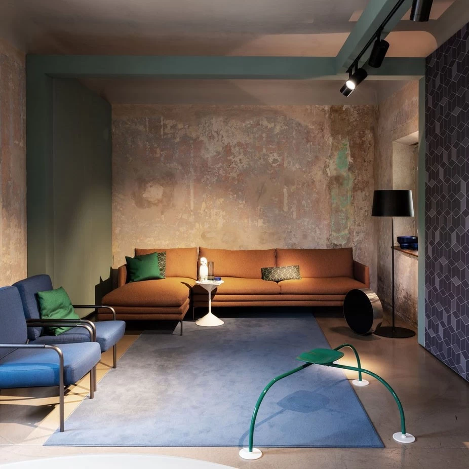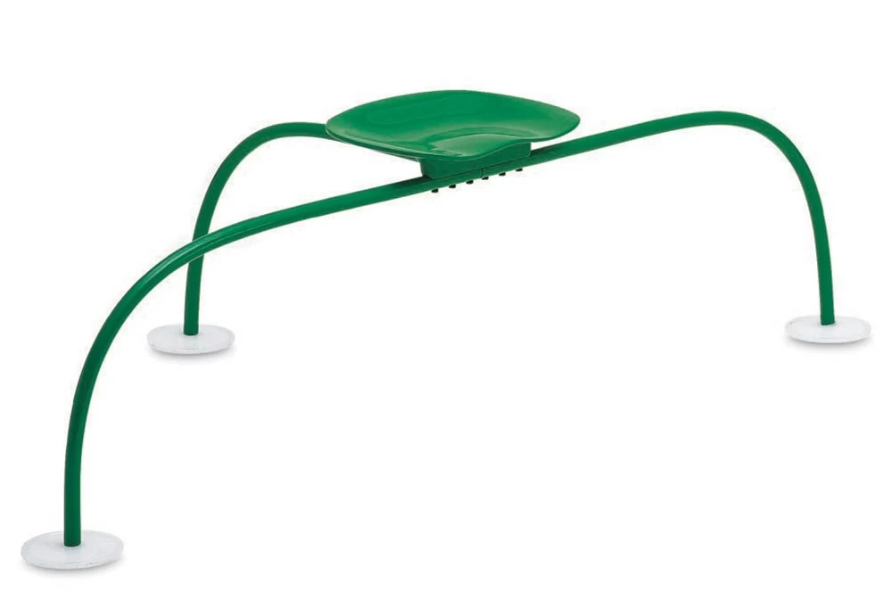 Der grüne Gartenhocker Allunaggio von Zanotta ist ein Entwurf von Achille und Pier Castiglioni und typisch für ihren Designhumor: Der extreme Abstand zwischen den drei großen Tellerfüßen sollte den Rasen schonen. Entworfen im Jahr 1965 war das Design gleichzeitig eine Hommage an die Mondlandung, der Hocker wirkt bedingt durch die Tellerfüße wie eine abstrakte Mondlandefähre.