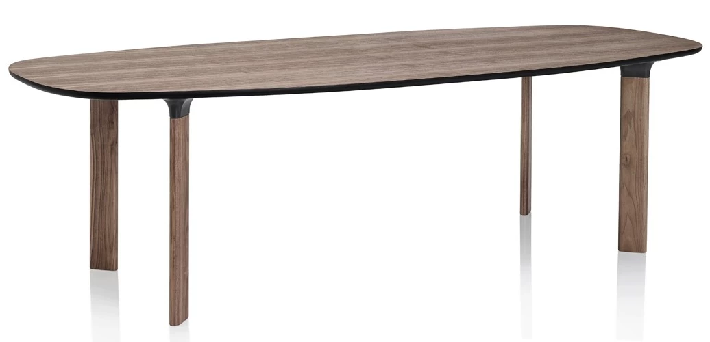 Die Tischplatte ist wahlweise weißes Laminat oder Eiche- und Nussbaumfurnier. Das Gestell aus Massivholz ist dazu passend in den Ausführungen in Eiche natur oder Nussbaum erhältlich. Die Beine sind mit einem Trichter aus weiß oder schwarz beschichtetem Aluminium an der Tischplatte befestigt.