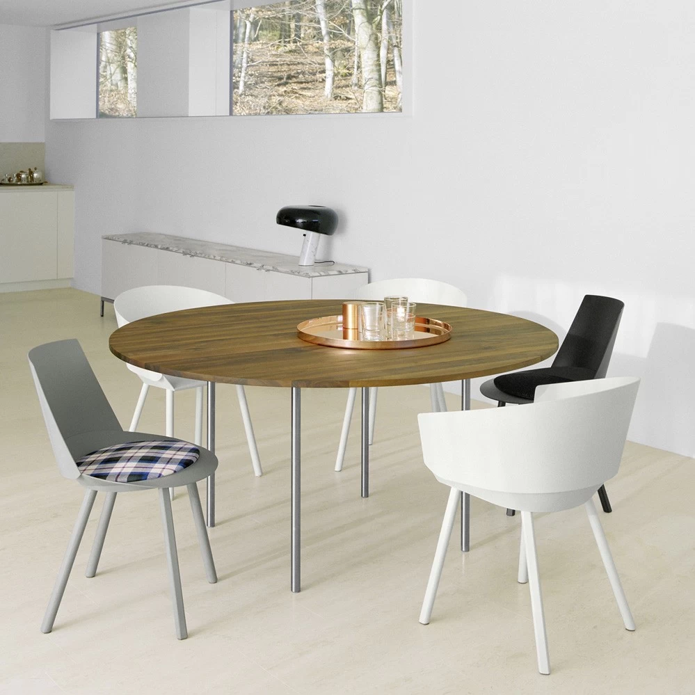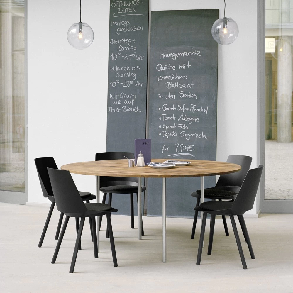 Reduziert in Material und Gestaltung, wird der runde Tisch Anton mit einer 20 mm starken Platte aus geölter Eiche angeboten. Der Tisch ist in zwei verschiedenen Durchmessern erhältlich und damit in unterschiedlichsten Räumlichkeiten einsetzbar. Die vier Tischbeine mit gering dimensioniertem Durchmesser sind so montiert, dass sie die Möglichkeit einer uneingeschränkten Sitzverteilung von bis zu sechs bzw. acht Plätzen bieten. Zusätzlich ist der Tisch noch als rechteckige Variante bei e15 erhältlich.