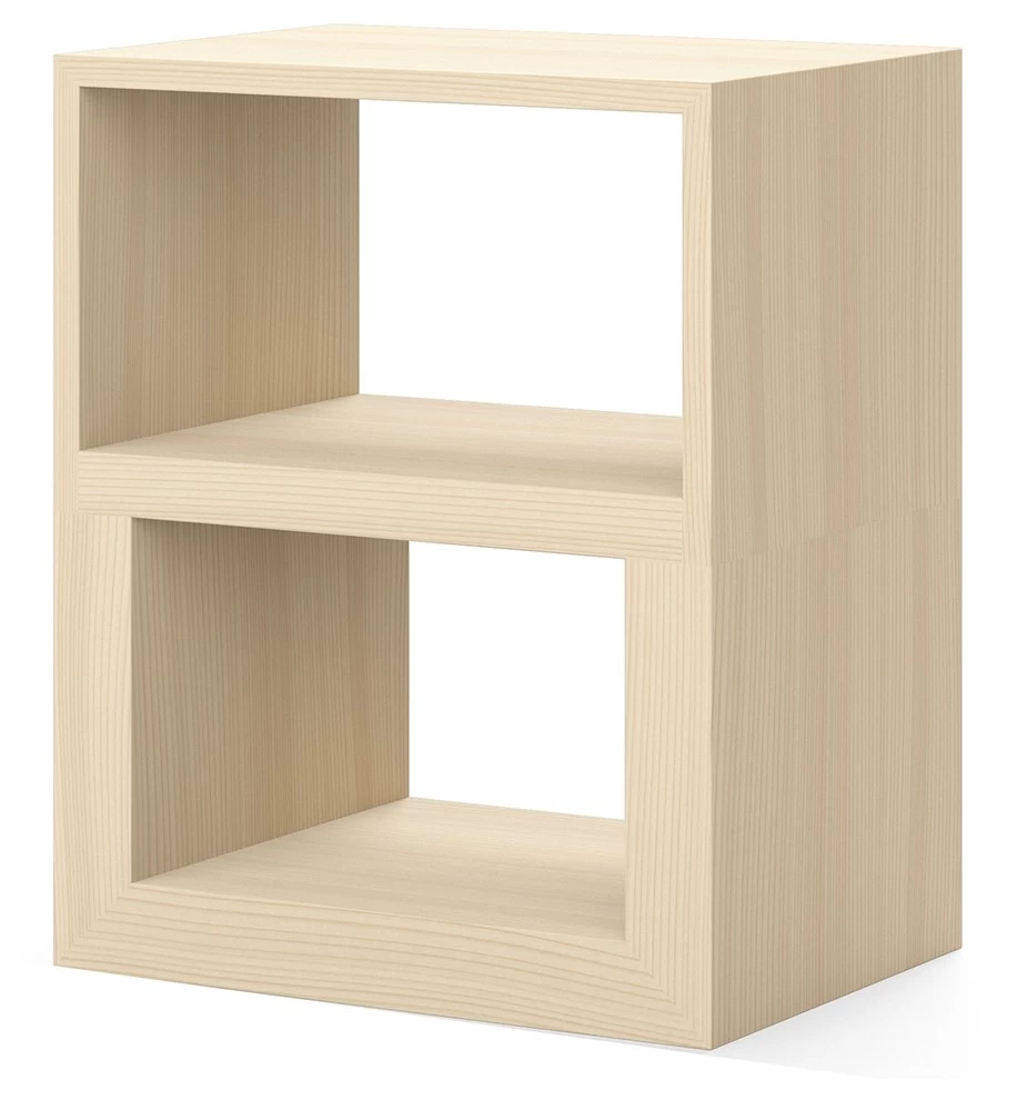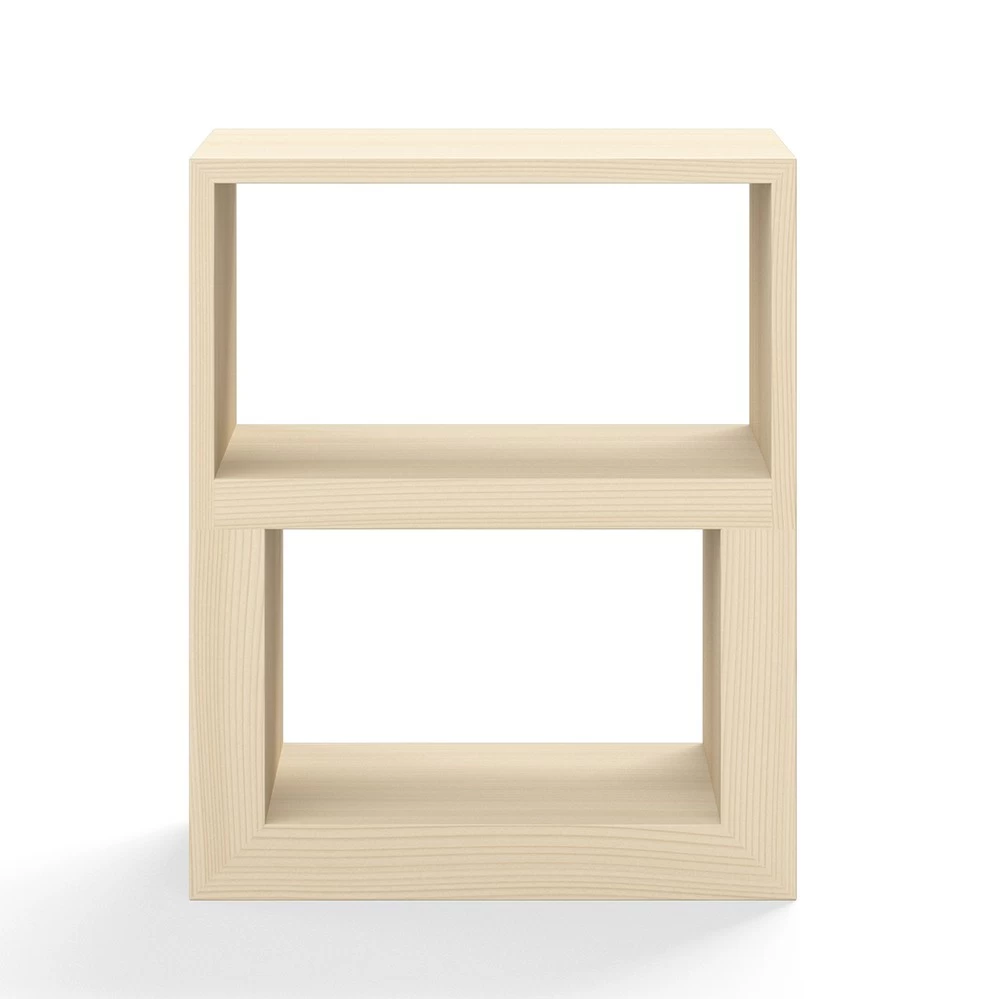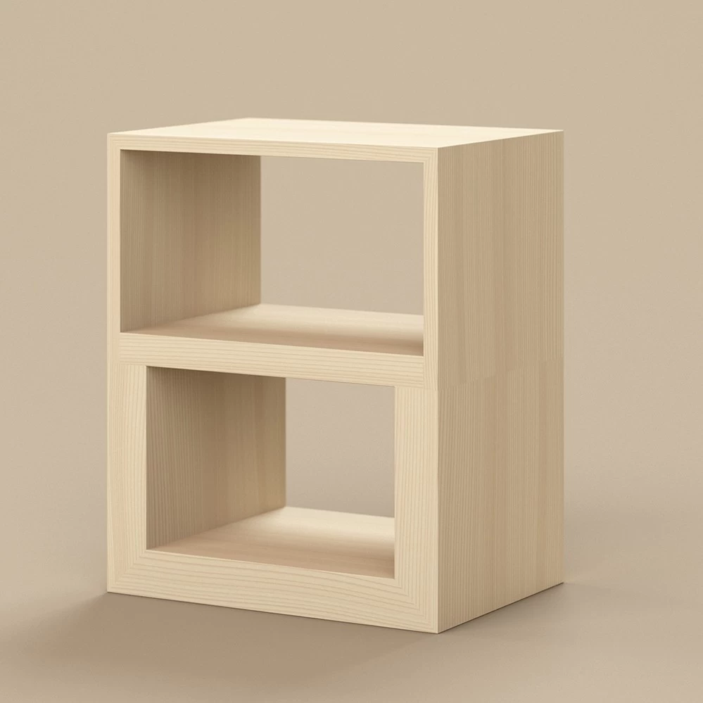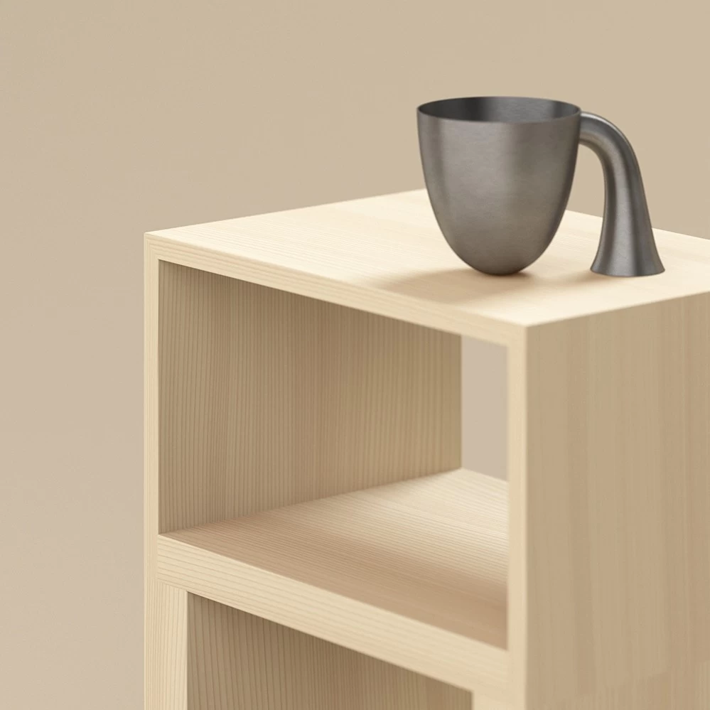 Das Cabinet von Aldo Bakker ist kein Kabinett, sondern ein Multifunktionsmöbel, dass als BEistelltisch oder kleines Regal Regal dienen soll. Gefertigt aus Fichte, erinnert uns der Entwurf aus dem Jahr 2024 aln den Ulmer Hocker von Max Bill und Hans Gugelot.