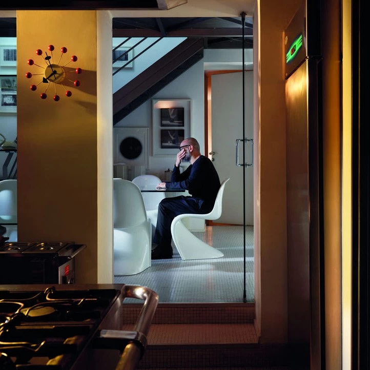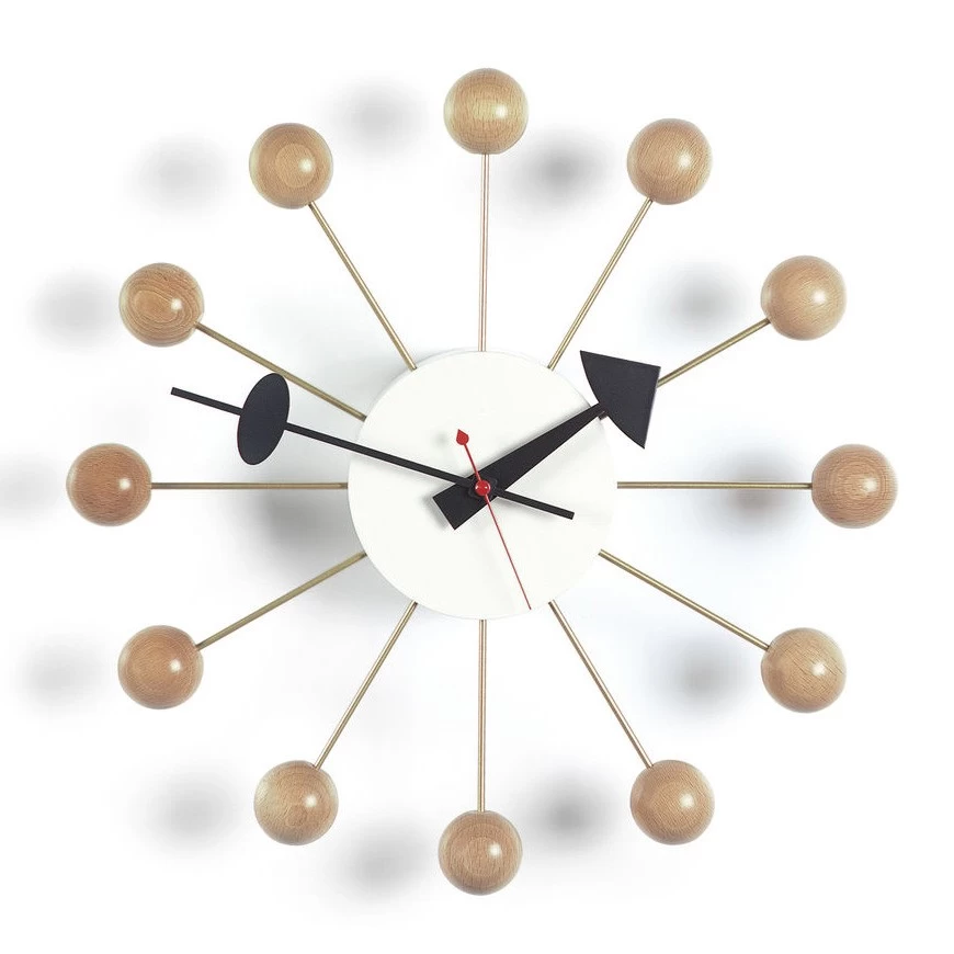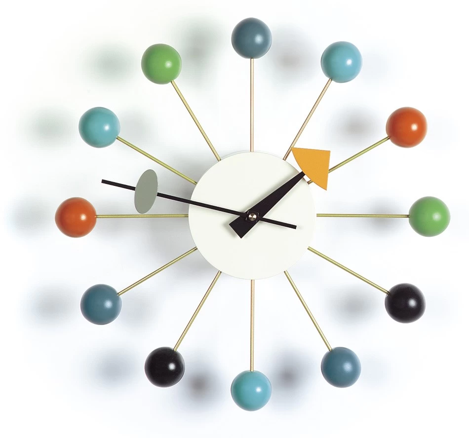 Die berühmte Ball Clock ist ein Entwurf des George Nelson Office aus dem Jahr 1947 und wurde schon immer in unterschiedlichn Farbvarianten ausgeführt. Der eigentliche Entwurf entstand dabei im Laufe eines geselligen Abends, an dem George Nelson, Iving Harper, Isamu Noguchi und Buckminster Fuller teilnahmen. Die zwölf runden Kugeln der Ball Clock sollten damals für das beginnende Atomzeitalter und den Fortschrittsglauben stehen. Die Kugel als ein Sinnbild für das Atom wurde in den 1950er Jahren häufig als Designelement eingesetzt – wie bei dem Antelope Chair von Ernest Race oder bei den Möbelentwürfen von Greta Grossman. Heute sind bei Vitra verschiedene Varianten der Ball Clock erhältlich:
