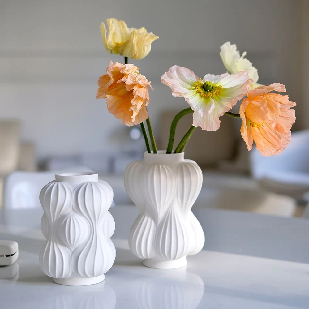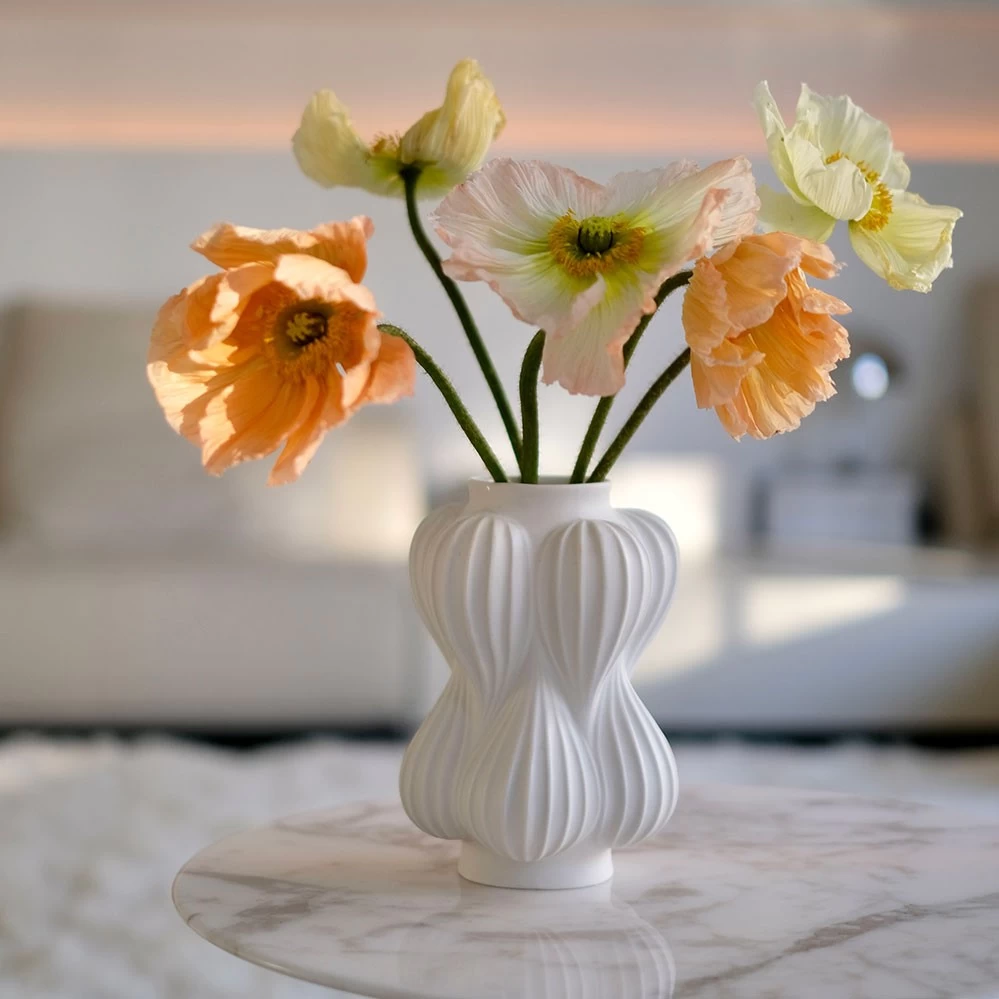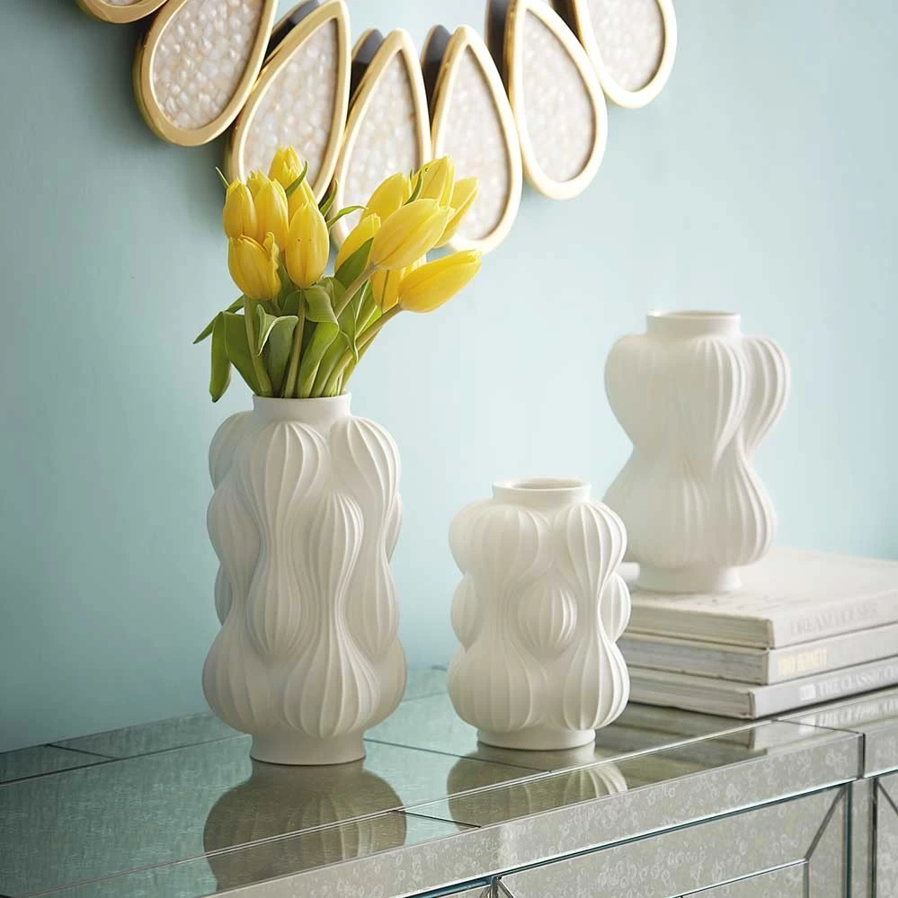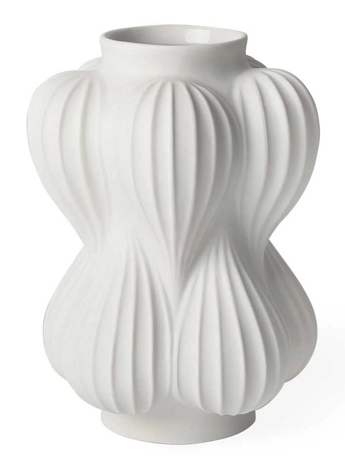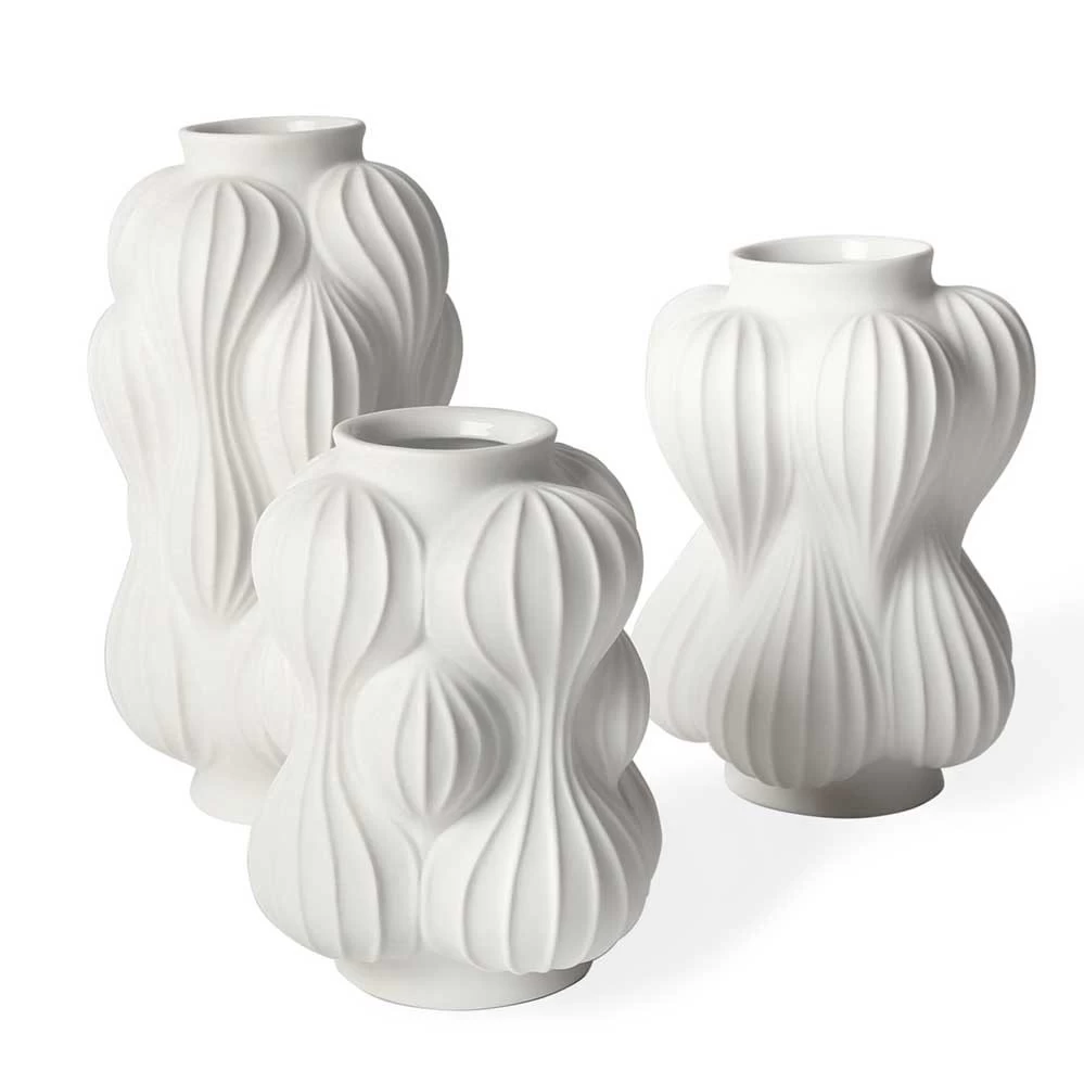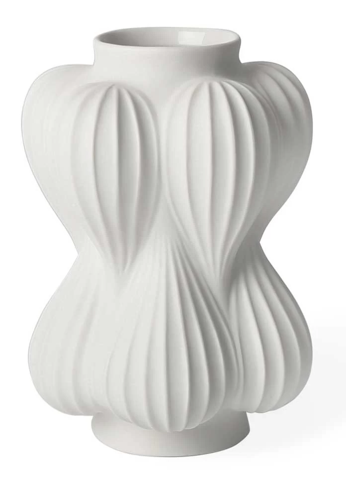 Die rund 21 cm Balloon Vase ist die mittlere Variante der drei Balloonvasen von Jonathan Adler. Inspiriert wurde er dabei von der Natur und seinen Relief Keramiken. Dabei bringen die wellenförmigen Ballonvasen aus mattem Porzellan noch eine zusätzliche Tiefe und Dimension ins Spiel.