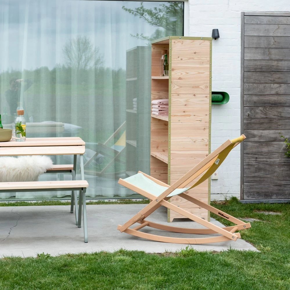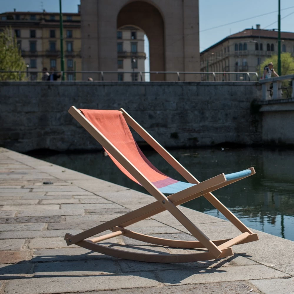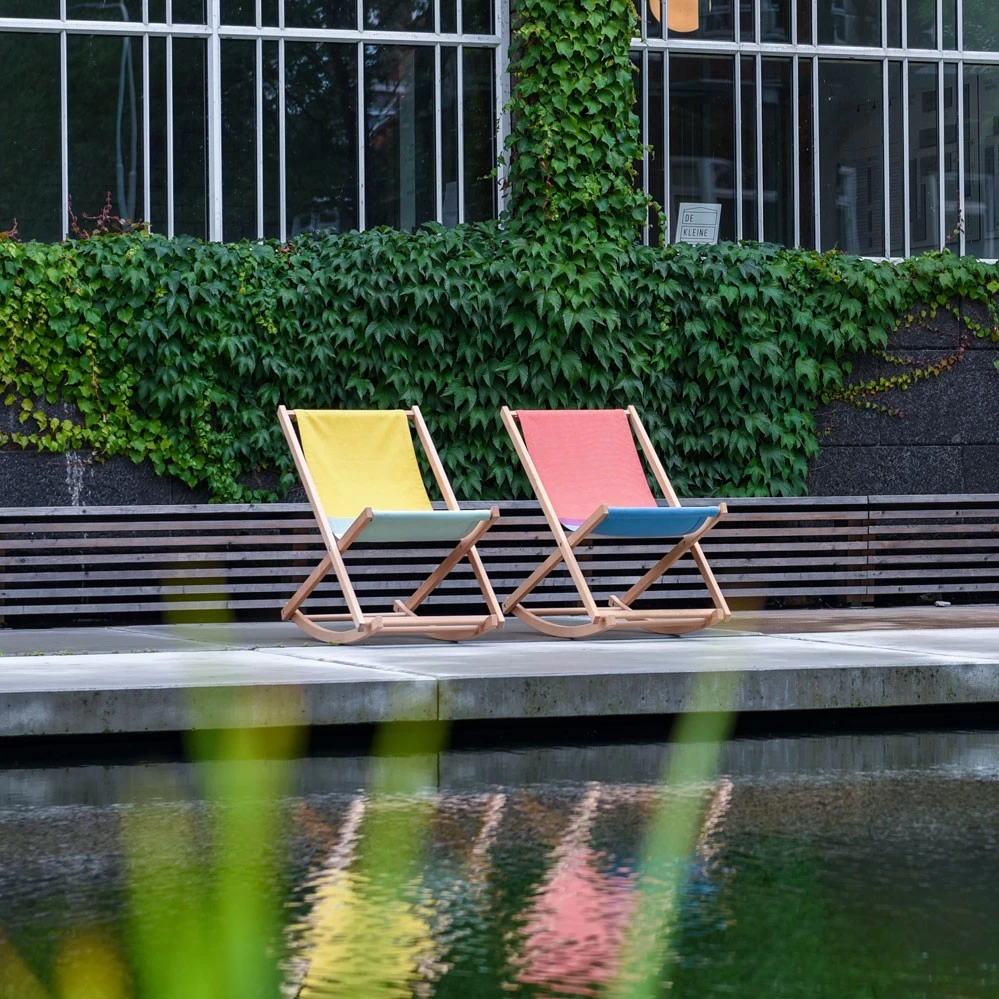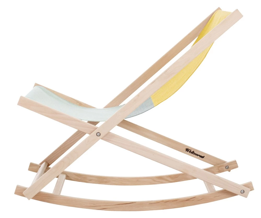 Der klappbare Schaukelstuhl Beechrocker von Erik Stehmann ist eine Weiterentwicklung des klassischen holländischen Strandstuhls. Für das Design des Textilbezugs arbeitete Erik Stehmann mit dem Designerduo Raw Color zusammen. Die Farben des fröhlichen Stoffs verweisen auf subtile Art zum Horizont.