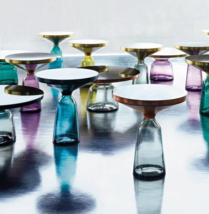 Der Bell Table stellt den gewohnten Umgang mit Materialien auf den Kopf und überrascht unsere Wahrnehmung: hier wird der Tischfuß zur prägnanten Glasform im Raum, auf dem ein Metallkörper aufliegt. Das Glas verleiht dem an sich schweren Metall zu schwebender Leichtigkeit. Der traditionell in eine Holzform geblasene Glasfuß und der gedrückte Metallkörper treten dabei in einen spannenden Kontrast und bilden doch formal eine harmonische Einheit. Der Tisch ist ein Meisterwerk traditioneller Handwerkskunst. Jeder Tisch ist handgefertigt, deshalb sind z.B. kleinere Bläschen oder Unebenheiten im Glas kein Fehler, sondern ein Merkmal der Handarbeit.