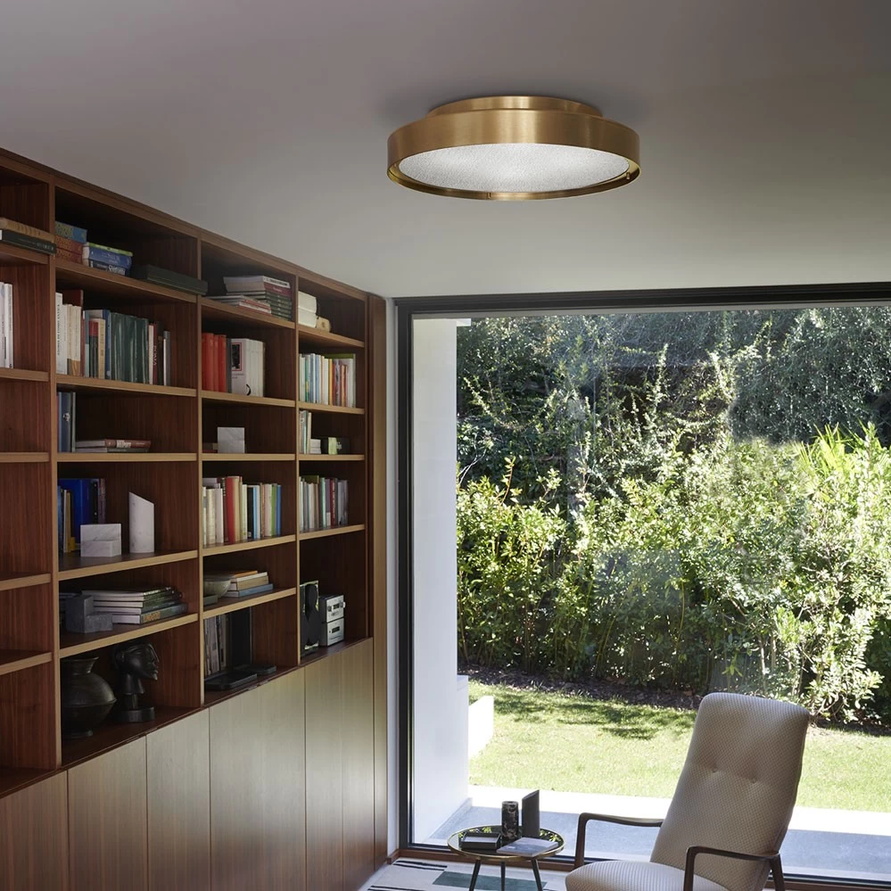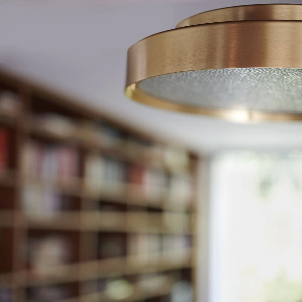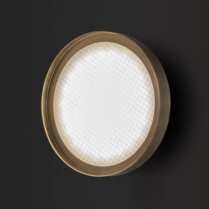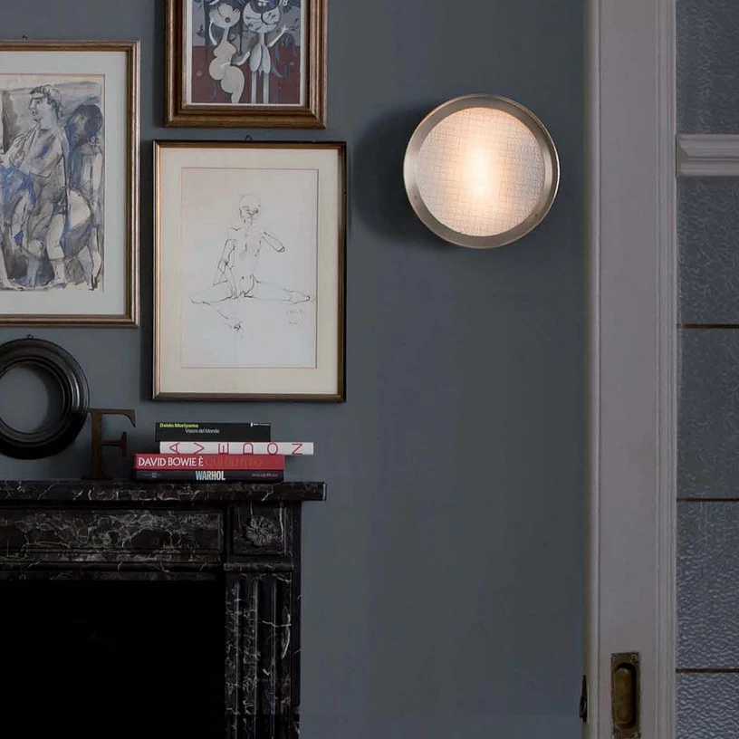 Die Oluce Messingleuchte Berlin kann wahlweise als Decken- oder Wandleuchte verwendet werden, der Glaskörper ist aus Drahtglas. Erhältlich ist der elegante Entwurf von Christophe Pille aus dem Jahr 2017 wahlweise in den Durchmesser 30 cm, 40 und 50 cm: