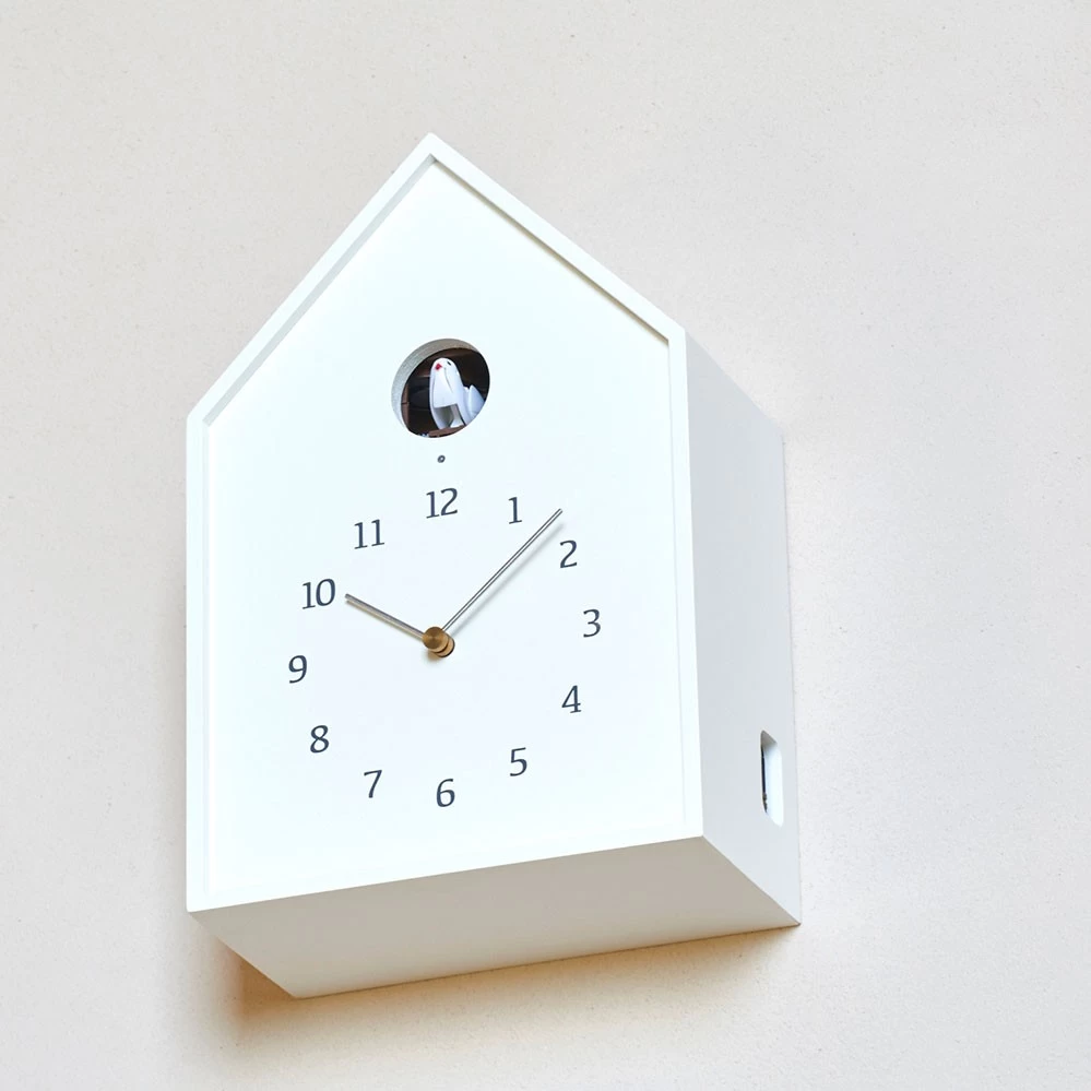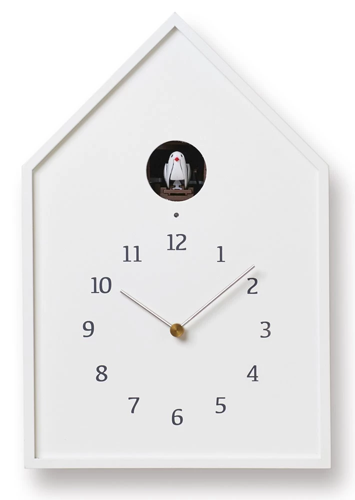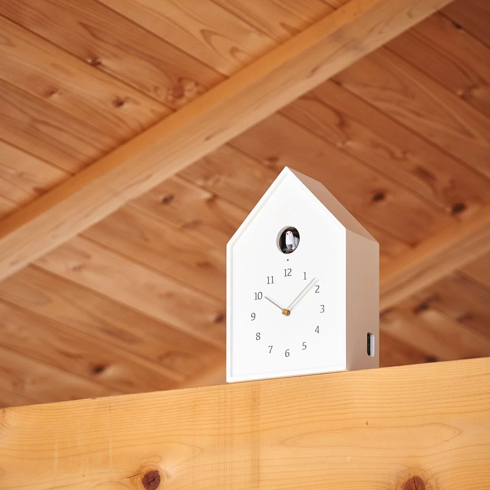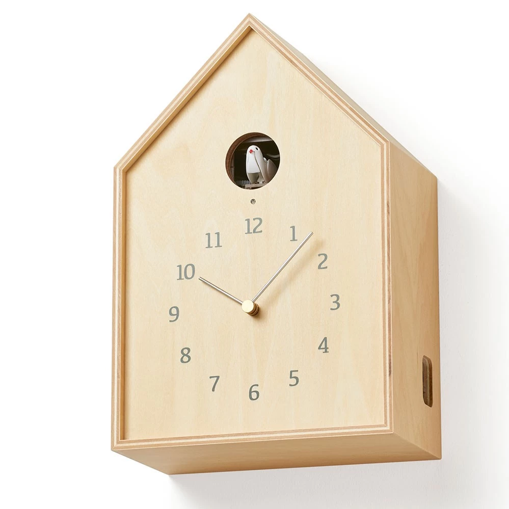 Ähnlich wie bei der Cucu Kuckucksuhr von Yuichi Nara greift auch die Birdhouse Kuckucksuhr aus dem Jahr 2022 die Idee der guten alten, deutschen Kuckucksuhr auf. Gefertigt wird die Wanduhr aus Schichtholz und istmit einem Lichtsensor ausgestattet.