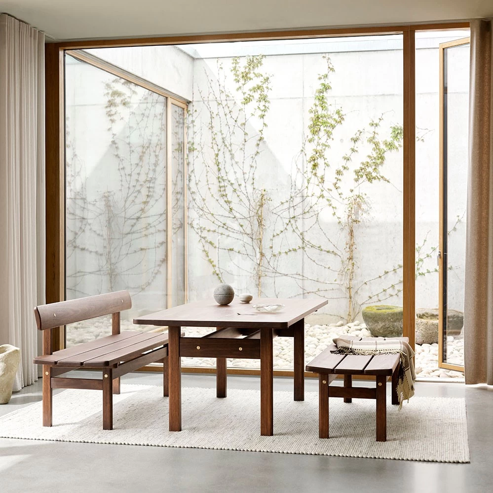 Die Asserbo Bank ist Bestandteil einer Sitzgruppe, die Børge Mogensen 1961 für sein Ferienhaus im dänischen Asserbo entwarf. 2022 wurden dies Möbelvon Carl Hansen in dunklen Eukalyptusholz wieder aufgelegt wurde. Die kleine Möbelserie besteht aus dem Esstisch und zwei verschiedenen Bänken . Dieser Entwurf mit den Messingappikationen begeisterte uns bei den 3 Days of Design dieses Jahr in Kopenhagen auf Anhieb. Erhältlich ist die Asserbo Sitzbank 700 wahlweise mit ohne den Sitzkissen.