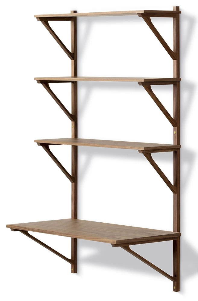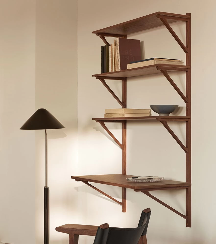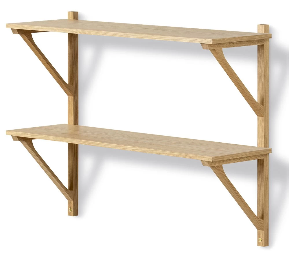 Das Wandregal BM 29 entwarf Børge Mogensen 1956, 2023 wurde es von Fredericia neu aufgelegt. Die Schienen und Halterungen bestehen aus Massivholz, die Regalböden aus Furnier. Die 77,5 cm breite Version ist dabei in zwei Größen erhältlich: