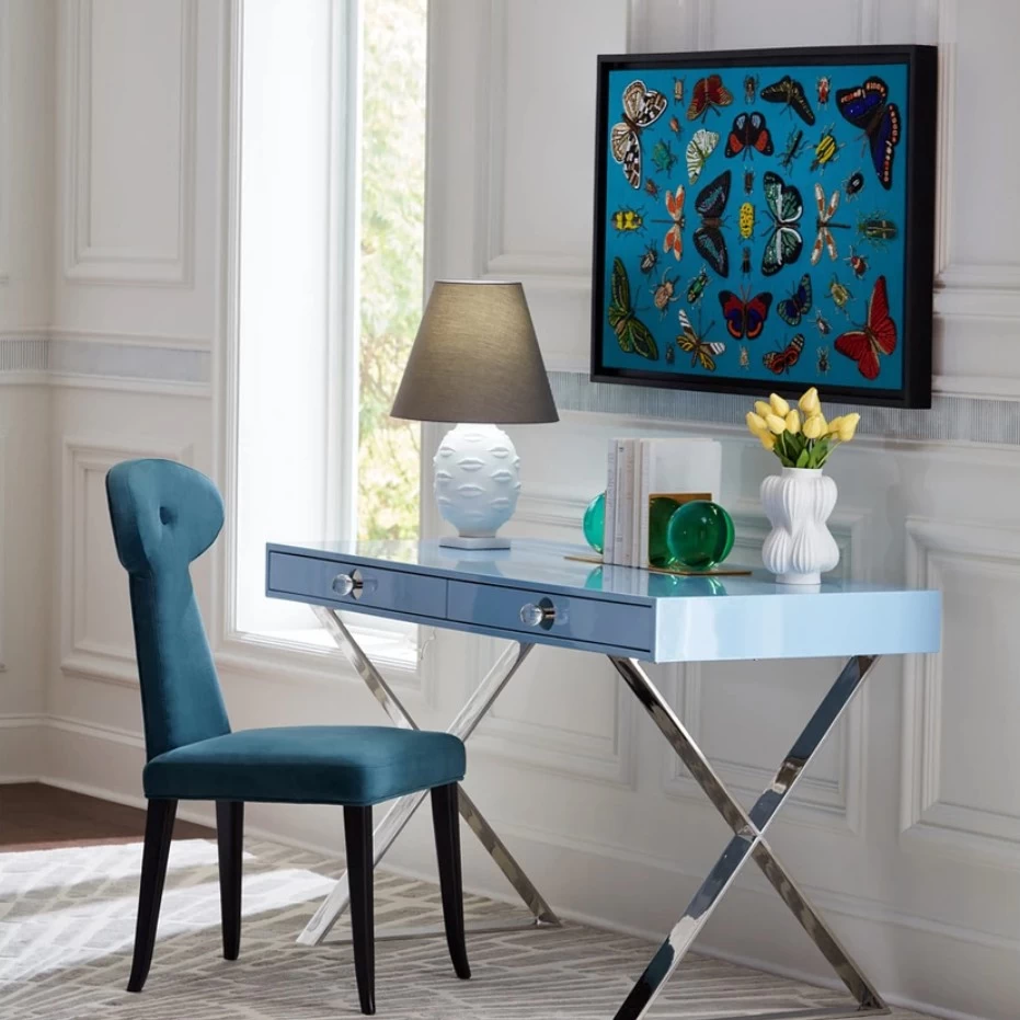 Das dreidimensional anmutende Wandbild Botanist Beaded Wall Art mit den ganz Schmetterlingen zählt zu einer Serie von künstlerischen Wandbildern, die Jonathan Adler ab 2019 entwarf. Gefertigt wird diese Wandkunst in Indien in aufwendigster Handarbeit, für das Motiv sind über 100 Stunden handarbeit notwendig. Denn jedes Bild besteht aus Hunderten von kleinen Perlen, die einzeln auf dem Hintergrund aus Leinen gebördelt werden und so für den gewünschten Glamour-Effekt sorgen. Diese Glasperlen in unterschiedlichen Größen und Mustern erzeugen ein Gefühl von Tiefe und Dimension. Das Ergebnis ist teils Pop-Art, teils Textilkunst.