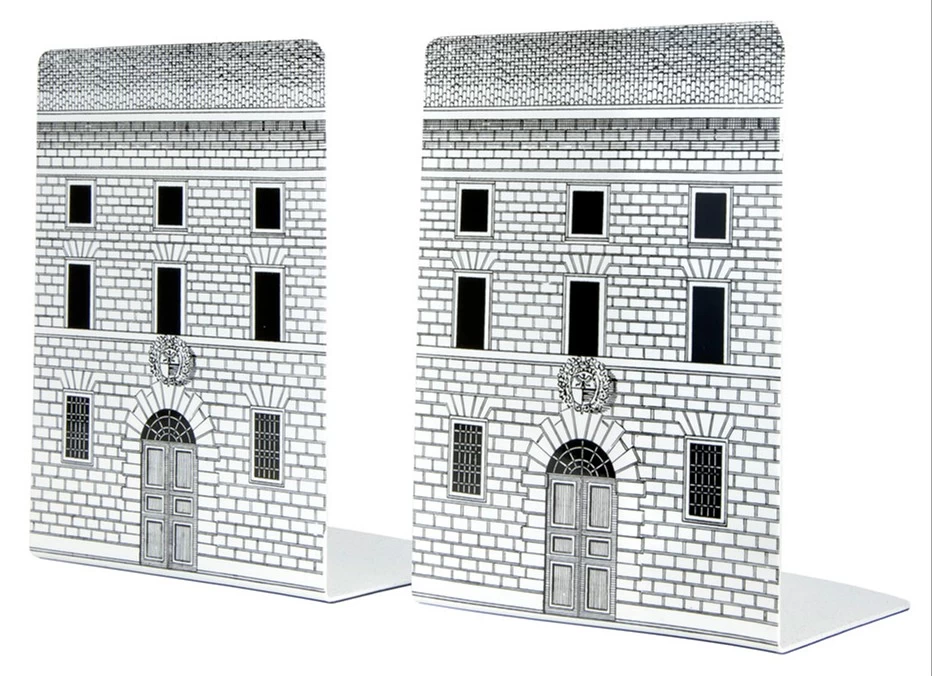 Das Motiv der beiden Buchstützen von Piero Fornasetti greift eines seiner Architekturmotive auf. Aus dem sehr umfangreichen Fornasetti-Kosmos präsentiert Markanto eine kuratierte Auswahl, viele weitere Entwürfe gerne auf Anfrage. (Markanto ist Fornasetti Fachhändler).