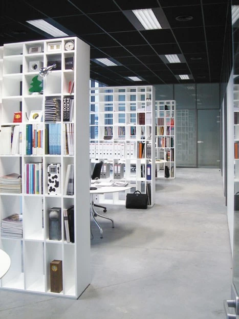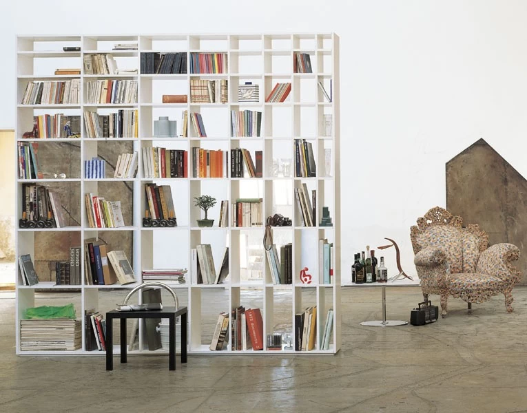 Das asymetrische und minimalistische Bücherregal von Cappellini ist ein Entwurf des japanischen Entwerfers Shiro Kuramata aus dem Jahr 1970 und als Raumteiler konzipiert (daher ohne Rückwand).