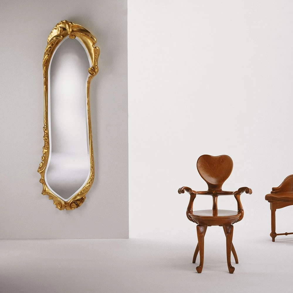 Ein Meisterwerk von Antoni Gaudi ist der Spiegel aus der Inneneinrichtung der Casa Calvet in Barcelona, das Original findet sich heute im katalanischen Jugendstilmuseum, wo wir es mal bewundern konnten. Bei der künstlerischen Reedition von bd Barcelona ist der Rahmen des 195 cm hohen Wandspiegels vergoldet.
