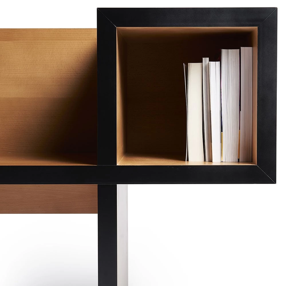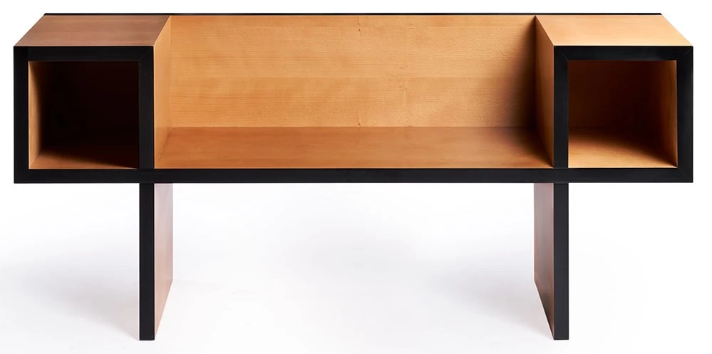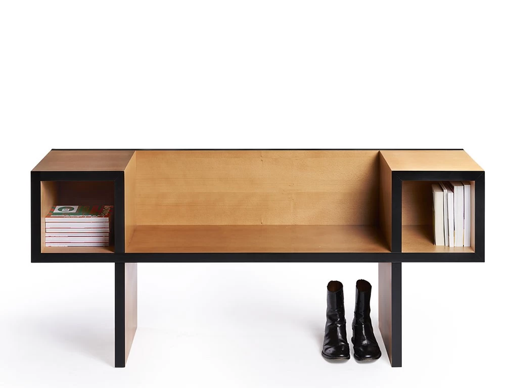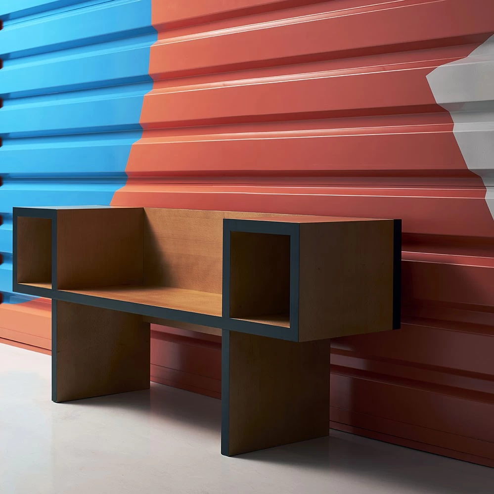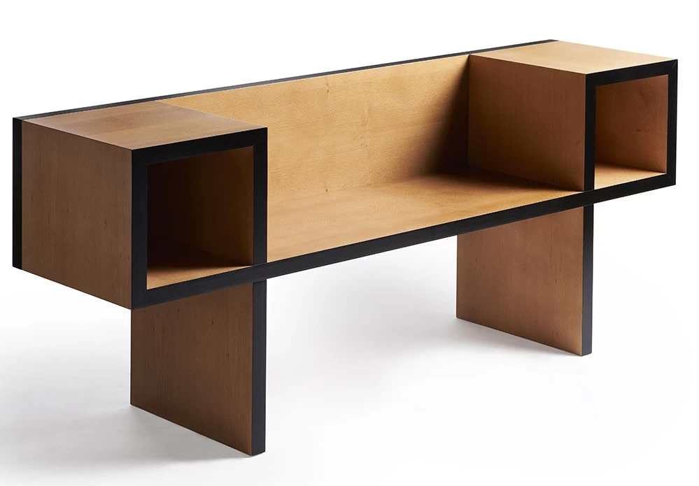 Die kubische Sitzbank ist ein Entwurf des italienischen Designers Franco Raggi aus dem Jahr 1988. Dabei dienen die Armlehnen der 170 cm langen Bank gleichzeitig als Ablagen,