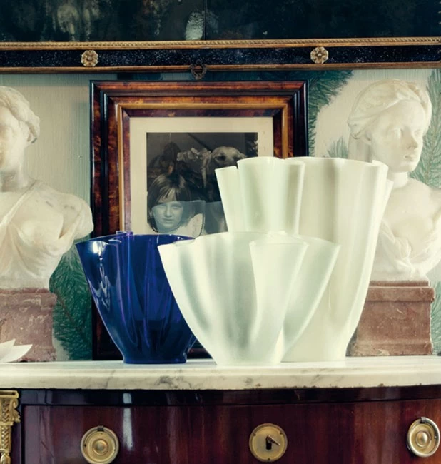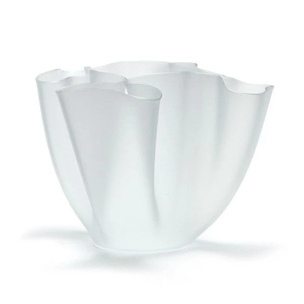 Die organisch geformte Cartoccio Vase von Pietro Chiesa stammt aus den 1930er Jahren, das letzte Foto zeigt eine historische Fontana Arte Anzeige aus der Zeitschrift Domus aus dem Jahr 1935. Erhältlich ist die Cartoccio Vase von Fontana Arte aus opalem, matt satinierten Glas. Ähnlich wie bei der Savoy Vase von Alvar Aalto wurden hier organische Formen neu interpretiert.