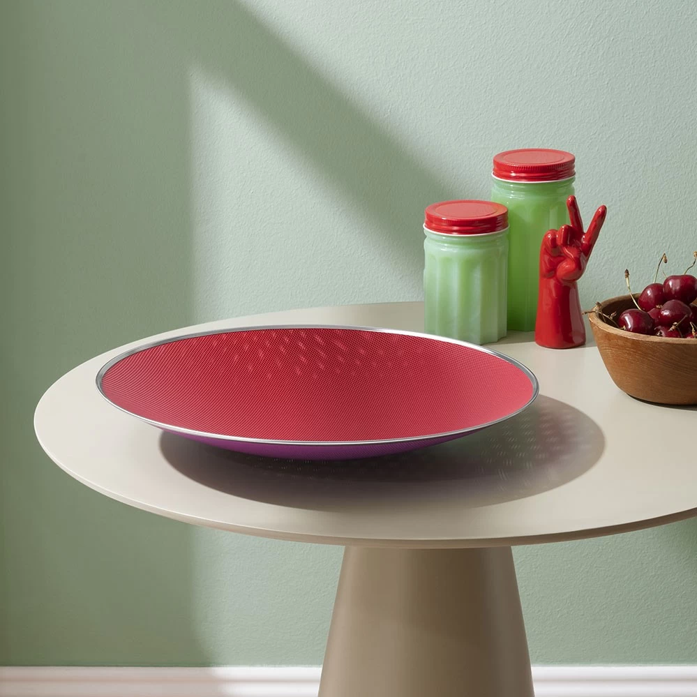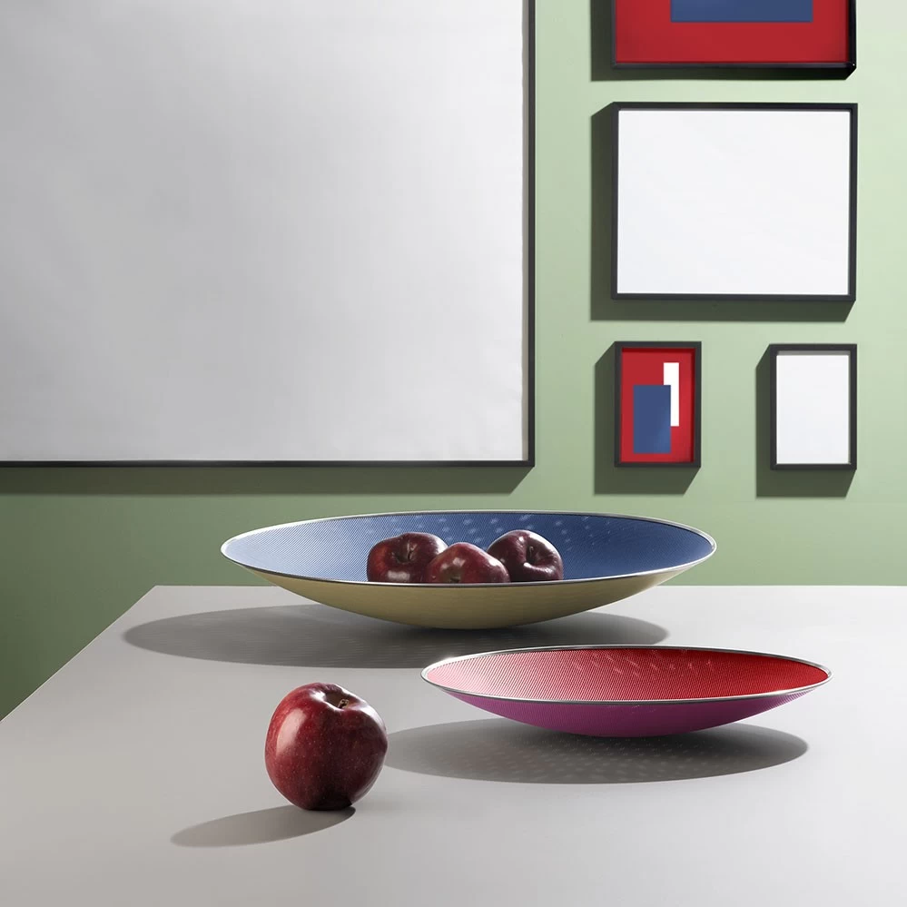 Im Rahmen von #alessi100 wurde 2021 die Cohncave Schale der Australierin Susan Cohn aus dem Jahr 1992 in neuen Farben aufgelegt. Bei dem Entwurf ließ sich die Designerin von Netzobjekten inspirieren, in denen einst Lebensmittel gelagert wurden. Sie entwickelte in einem cleveren Projektspiel einen raffinierten Moiré-Effekt, der durch das Durchdringen des Lichtes zwischen zwei sich überlappenden Metallnetzen mit einenm Edelstahlrahmen erzeugt wird.