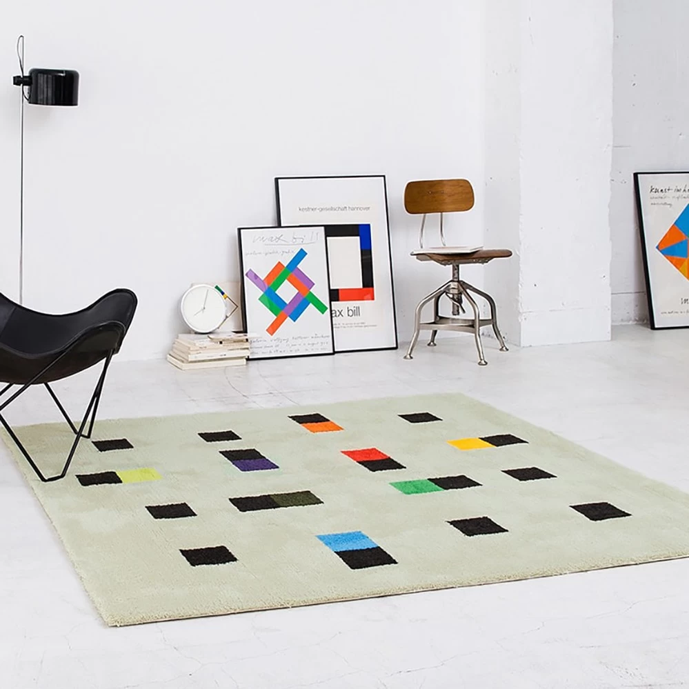 Auf dem grafischen Werk von Max Bill basiert der quadratische Teppich Colorful Accents. Hintergrund war hier eine mathematische Komposition, die Max Bill im Jahr 1946 erstellte. Dabei werden neun helle Farben auf dem weißen Hintergrund als eine Komposition von Quadraten angeordnet. Der Teppich wird dabei wahlweise aus preisgünstigem Acrylgarn oder aus Wolle produziert. Erhältlich ist der Colorful Accents Teppich, handgefertigt von Metrocs in Japan, in den drei Größen 160 x 160 cm, 180 x 180 cm und 200 x 200 cm.