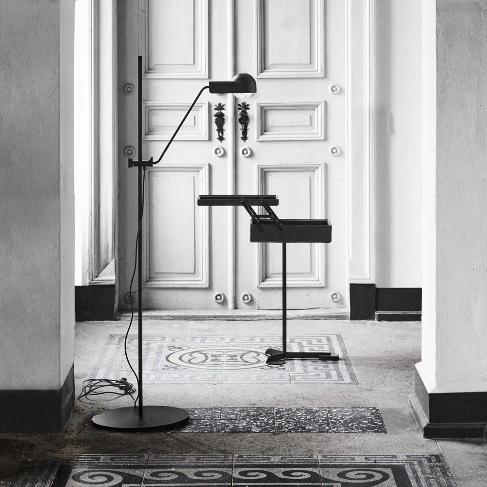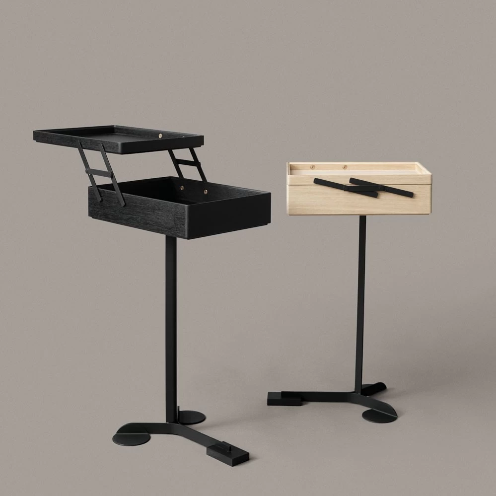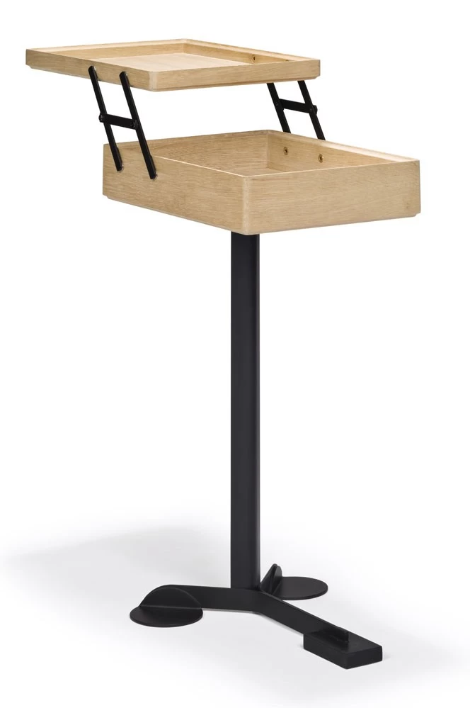 Während seiner gesamten Karriere arbeitete Achille Castiglioni daran, Design bis auf ein Minimum zu reduzieren und alles Überflüssige zu eliminieren. Einer der vielen Beweise für diesen Ansatz ist das ungewöhnliche Kabinett Comodo aus dem Jahr 1988. Comodo ist ein vielseitiges Möbel, das von Achille Castiglioni und Giancarlo Pozzi entworfen wurde. Es besteht aus einem langen Metallschaft, der auf einem Stativ montiert ist und einen kleinen Holzkorpus trägt. Der Korpus ist zentriert angeordnet und hat einen schalenförmigen Deckel, der sich mit Scharnieren öffnen und schließen lässt. Dieses elegante Mehrzweckmöbel kann als Nachttisch, Tablett, Couchtisch oder einfach als Aufbewahrungsbox verwendet werden. Angeblich benutzte Castiglioni, ein großer Fan von Süßigkeiten, seinen eigenen Comodo, um seine Süßigkeiten aufzubewahren.