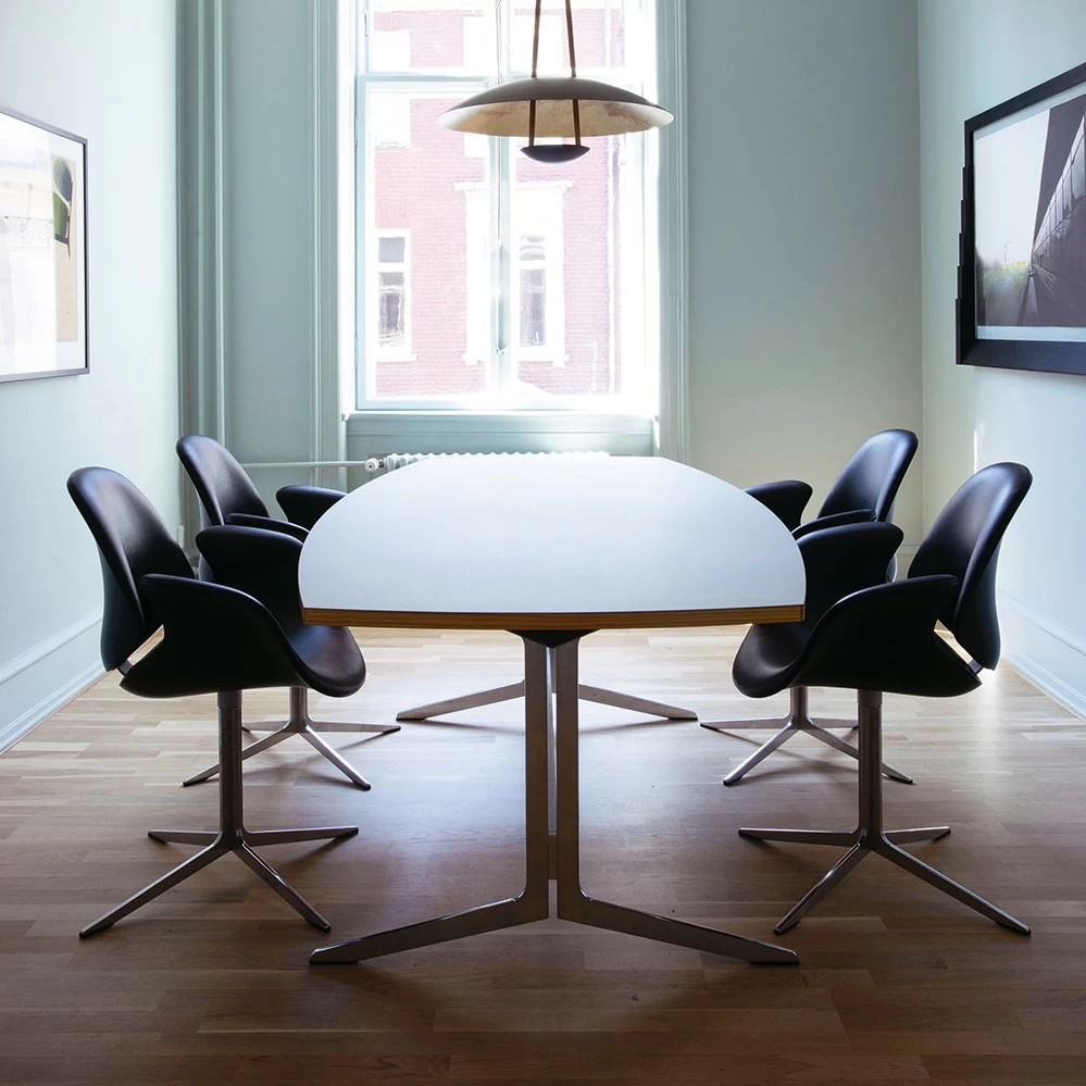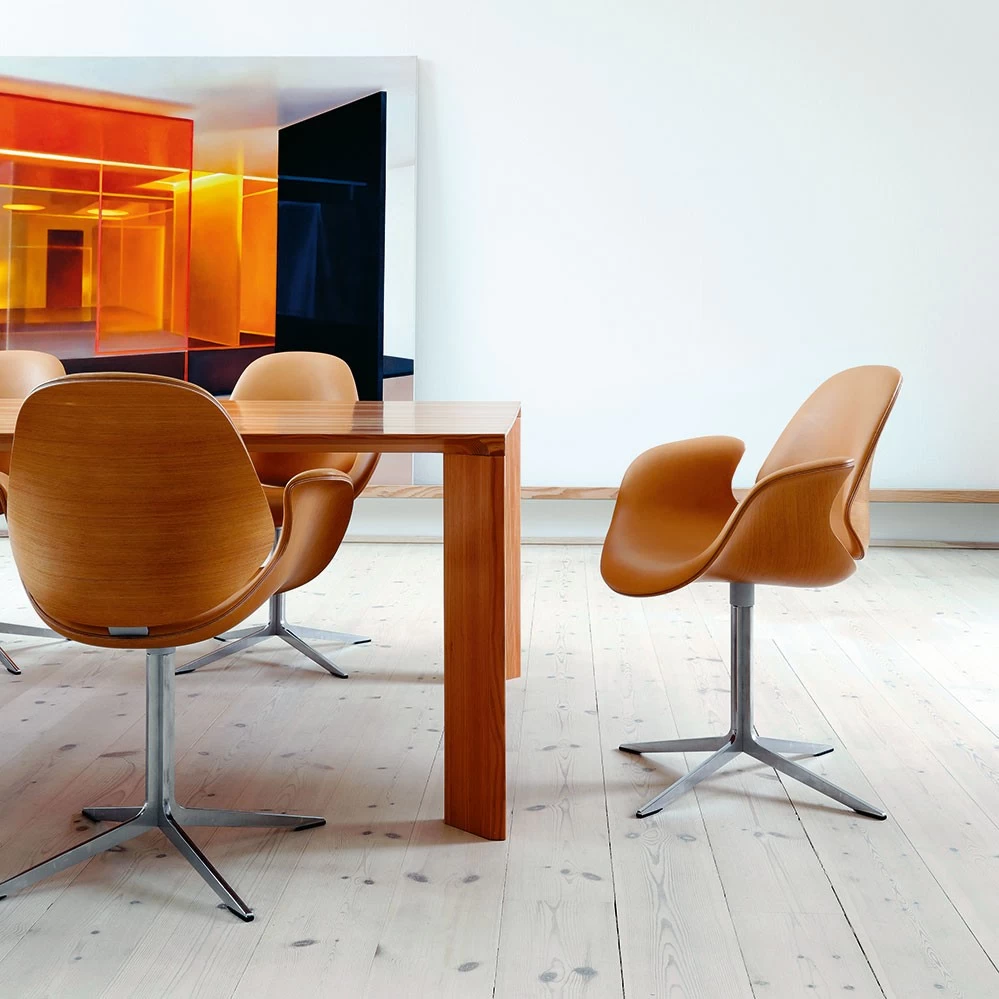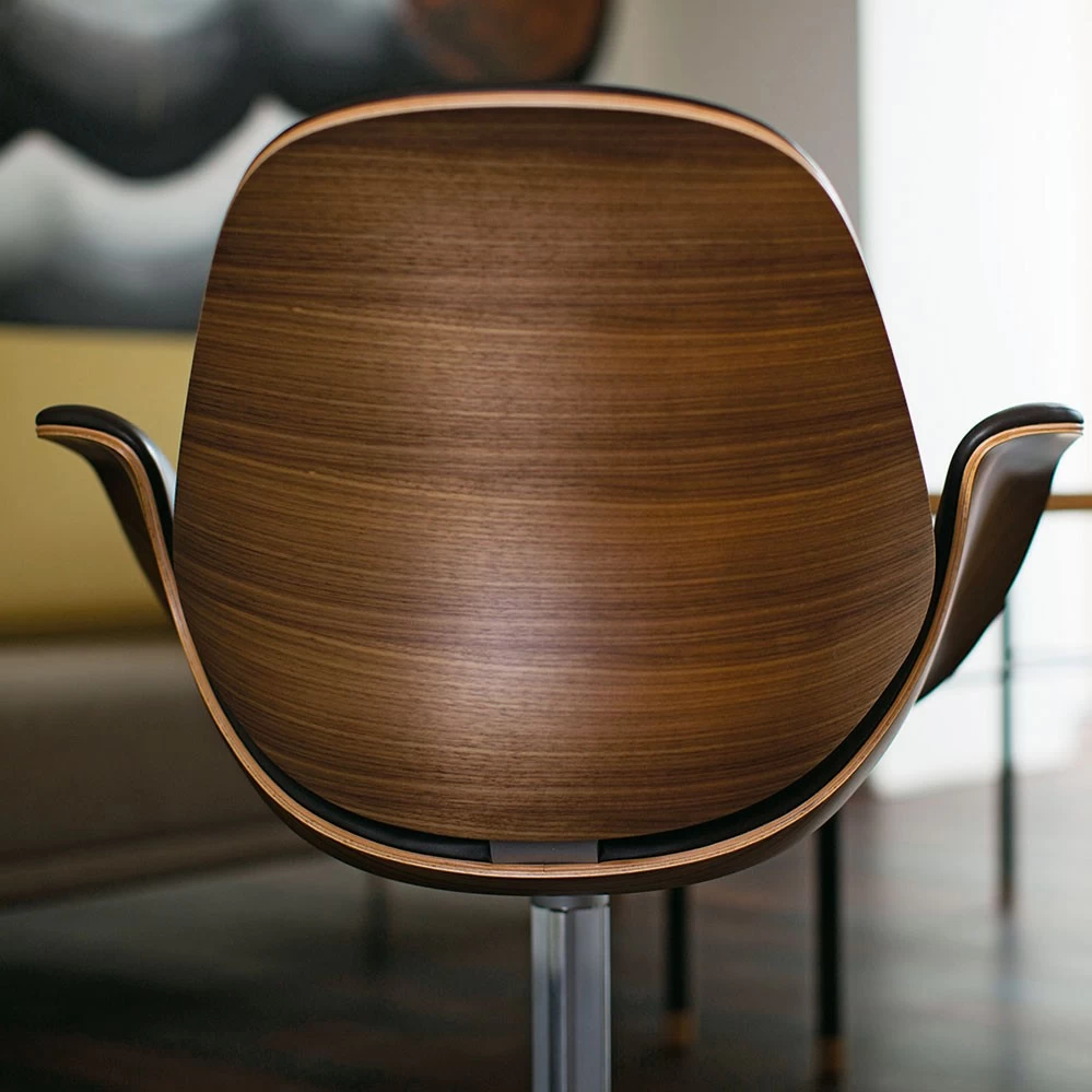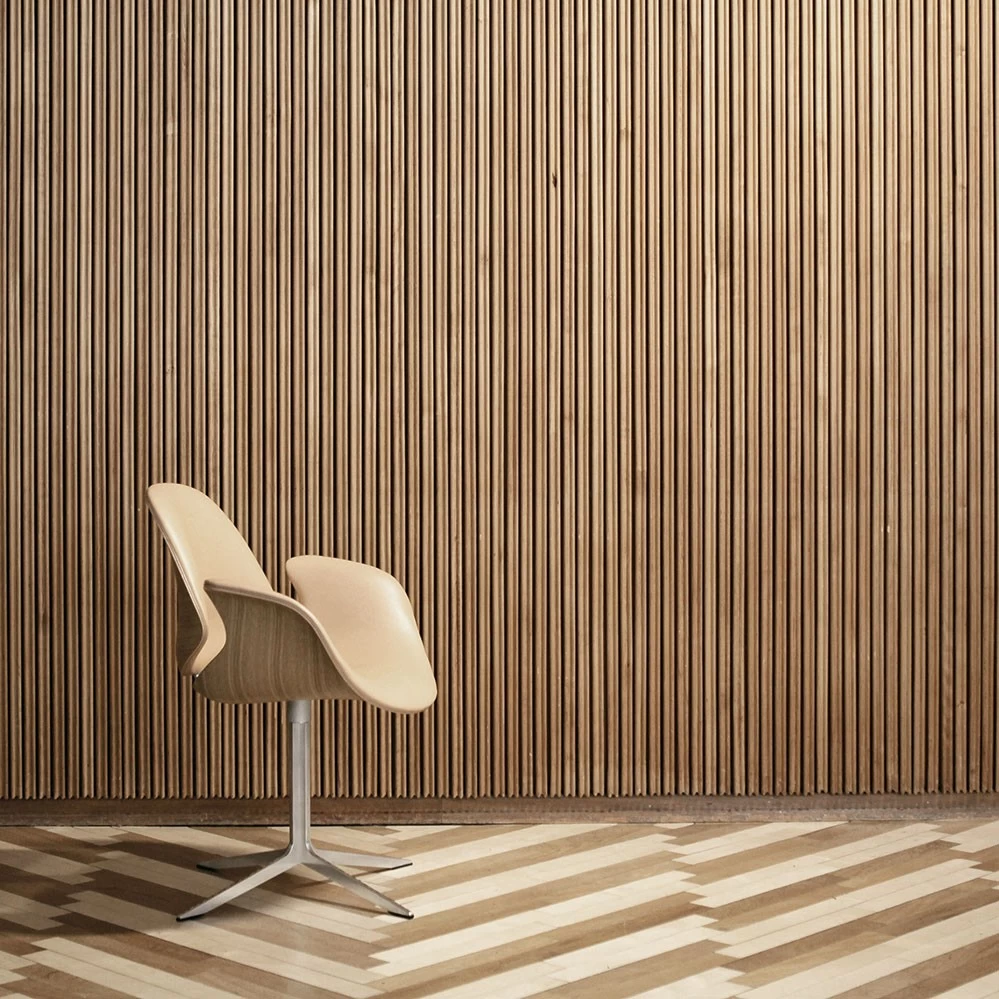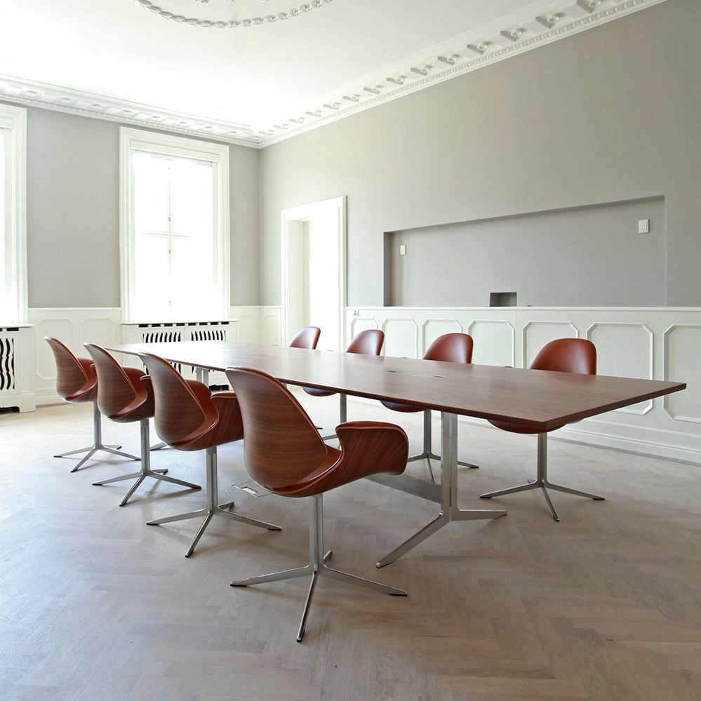 Der drehbare und bequeme Council Chair wurde im Jahr 2011 von Kasper Salto und Thomas Sigsgaard speziell für den Trusteeship Council Chamber im UNO-Gebäude in New York entworfen. Hintergrund für den Auftrag war die Zusammenarbeit der UNO mit OneCollection für die Renovierung der Inneneinrichtung, die in großen Teilen in den 1950er Jahren von Finn Juhl geplant wurde. Im Rahmen Renovierung wurde auch neue Stuhlmodelle benötigt, die wiederum von den dänischen Designern Kasper Salto und Thomas Sigsgaard konzipiert wurden. Der durchdachte Council Chair wird aus formgepresstem, 3D-Furnier in Eiche oder Nussbaum gefertigt, der Bezug ist wahlweise in Stoff (auf Anfrage) oder in Leder erhältlich. Im Laufe der Jahre enstand eine ganze Kollektion verschiedener Modelle (gerne auch auf Anfrage).