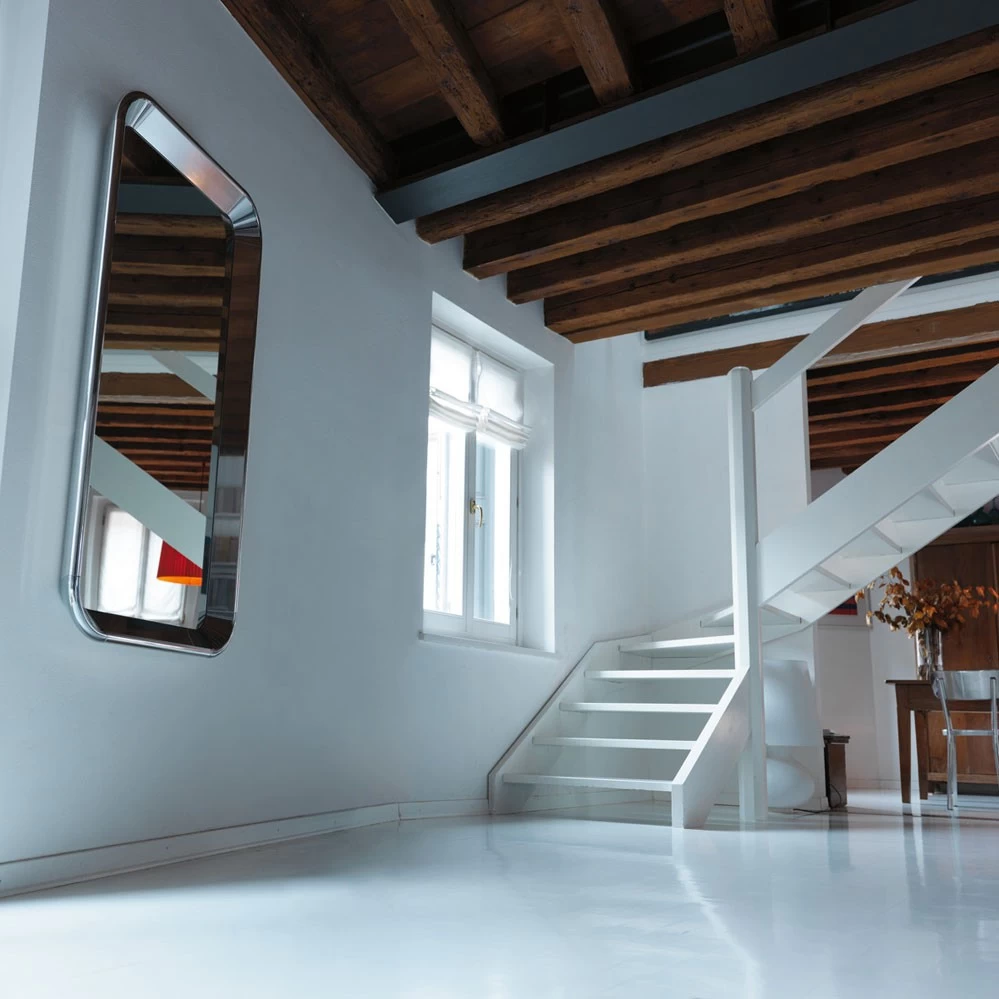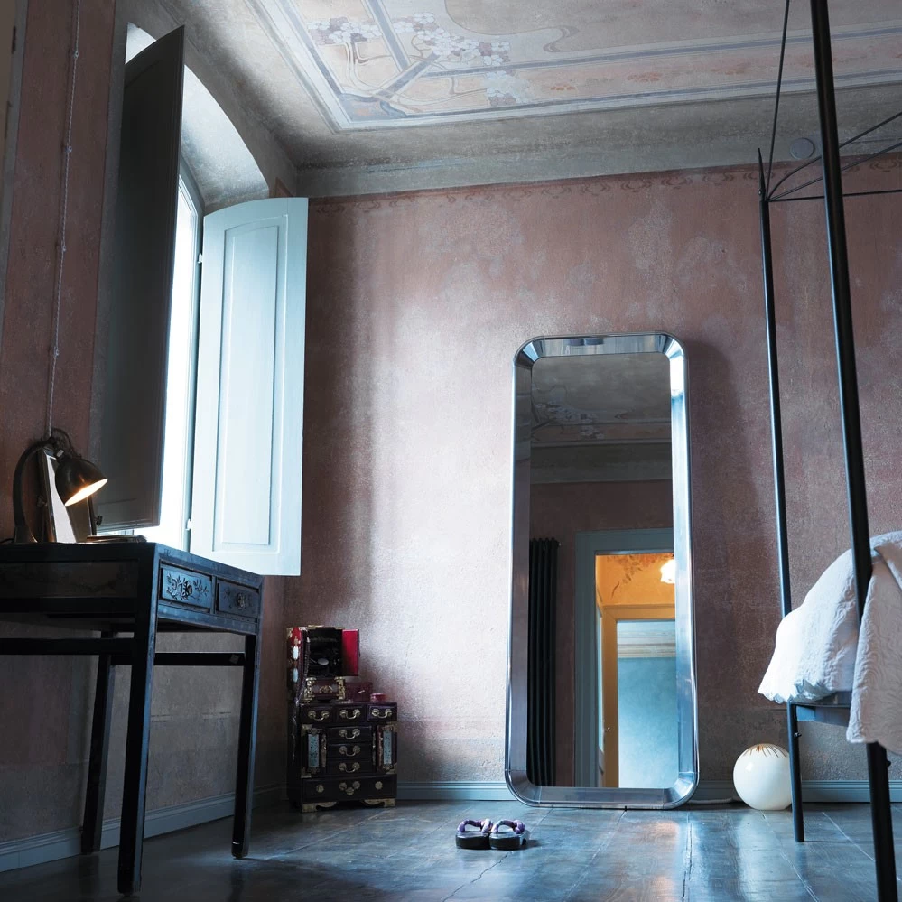 Der Aluminium-Spiegel aus der Déjà-vu Kollektion von Magis kann wahlweise direkt an der Wand montiert werden oder auf den Boden gestellt werden. Erhältlich ist der Spiegel von Naoto Fukasawa in drei Größen: