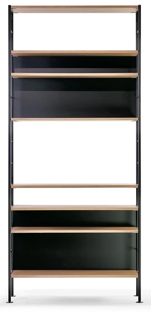 - DHS10 Leiterregal in Eiche natur, bestehend aus 2 Regalleitern (schwarz), 8 Regalböden 80 x 29,6 cm (Eiche-Furnier) und 2 Rückwänden (MDF schwarz), Wandhalterungen