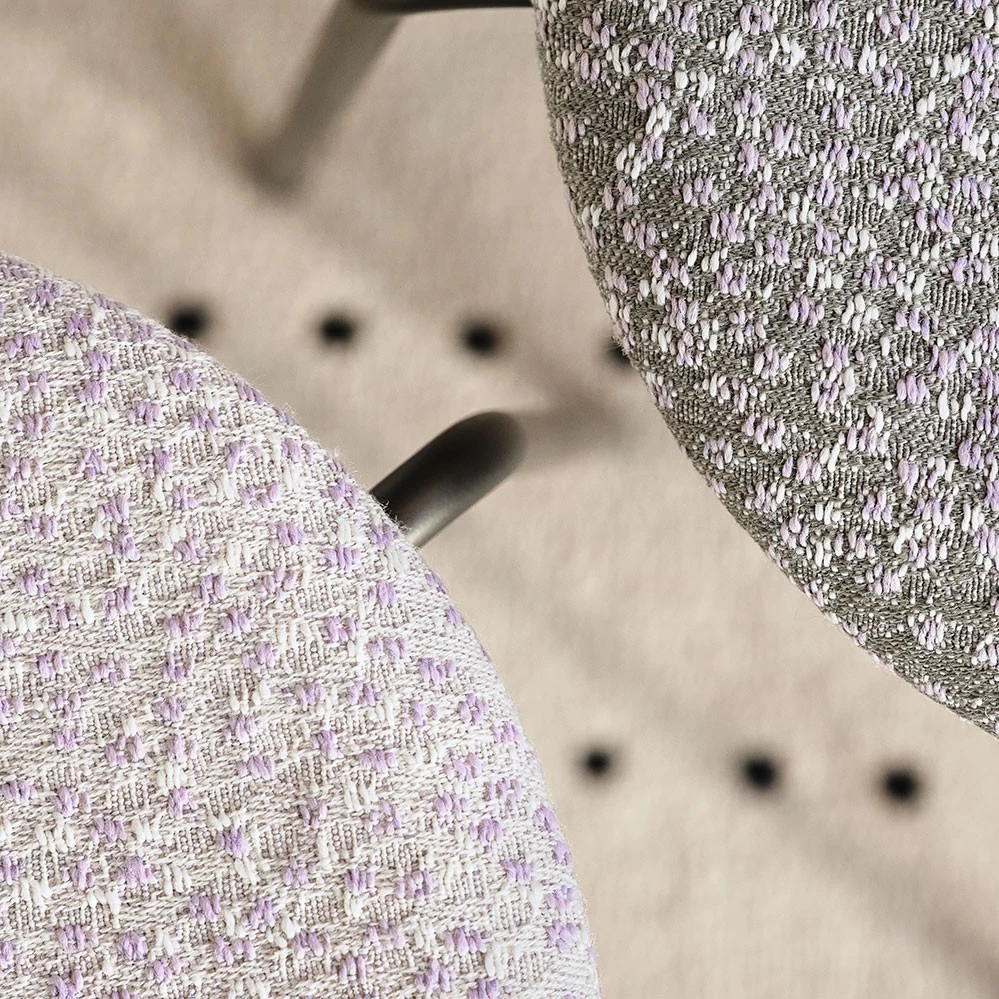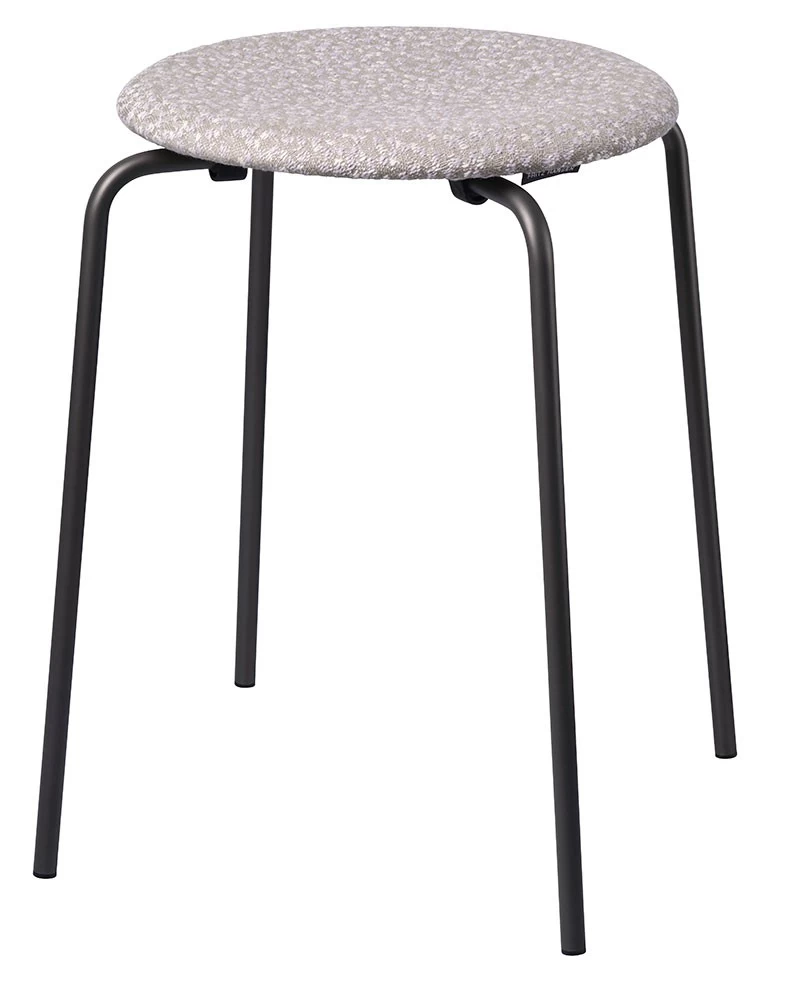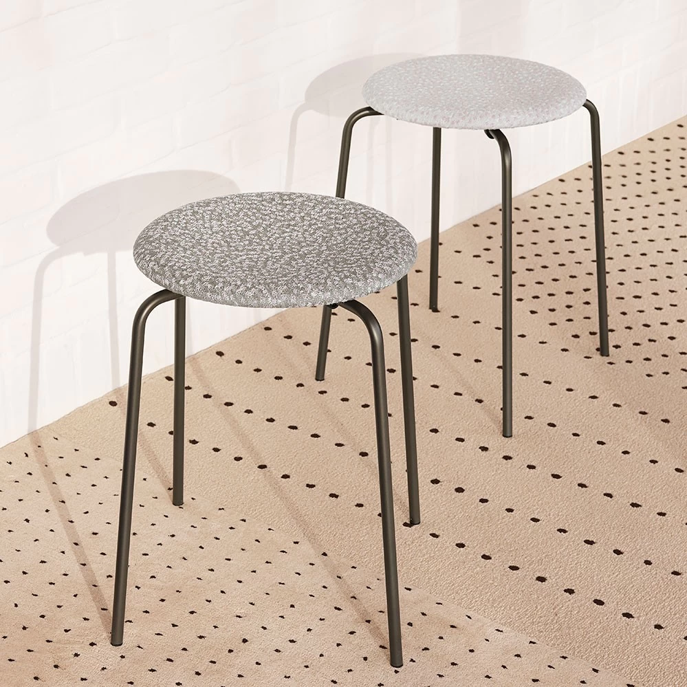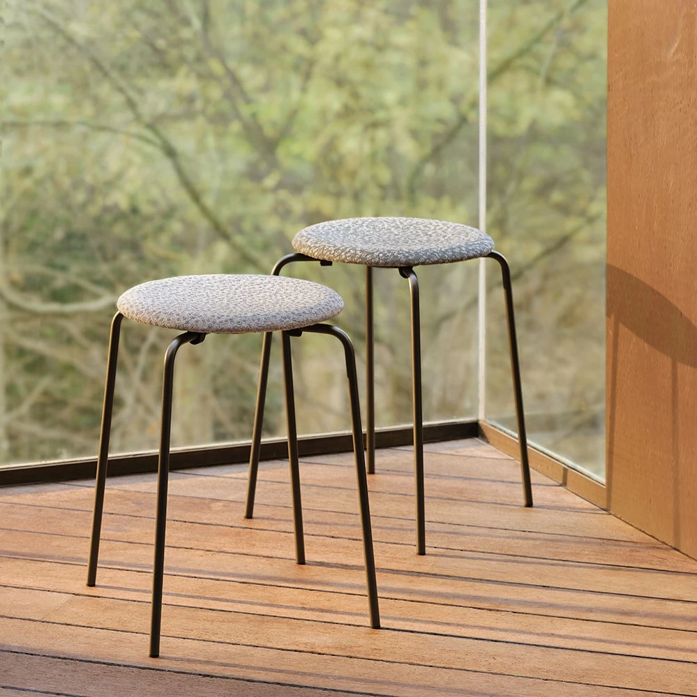 Zum 150jährigen Firmenjubiläum 2022 präsentiert Fritz Hansen den Hocker Arne Jacobsen Hocker erstmalig mit einer Sitzfläche aus Stoff. Als Bezug wurde ein stilvoller Ria-Polsterstoff in zwei Farben gewählt, entworfen von Raf Simons für Kvadrat. Die Farbe Ria 111 ist auf einem hellgrauen Grundgewebe mit Weiß- und Lavendeltönen gewebt, Ria 241 präsentiert sich mit anthrazitfarbenem Grundgewebe und denselben sanften Abstufungen. Das Gestell des Dot Hockers kommt in Warm Graphite, einem neutralen, zu allem passenden Farbton.