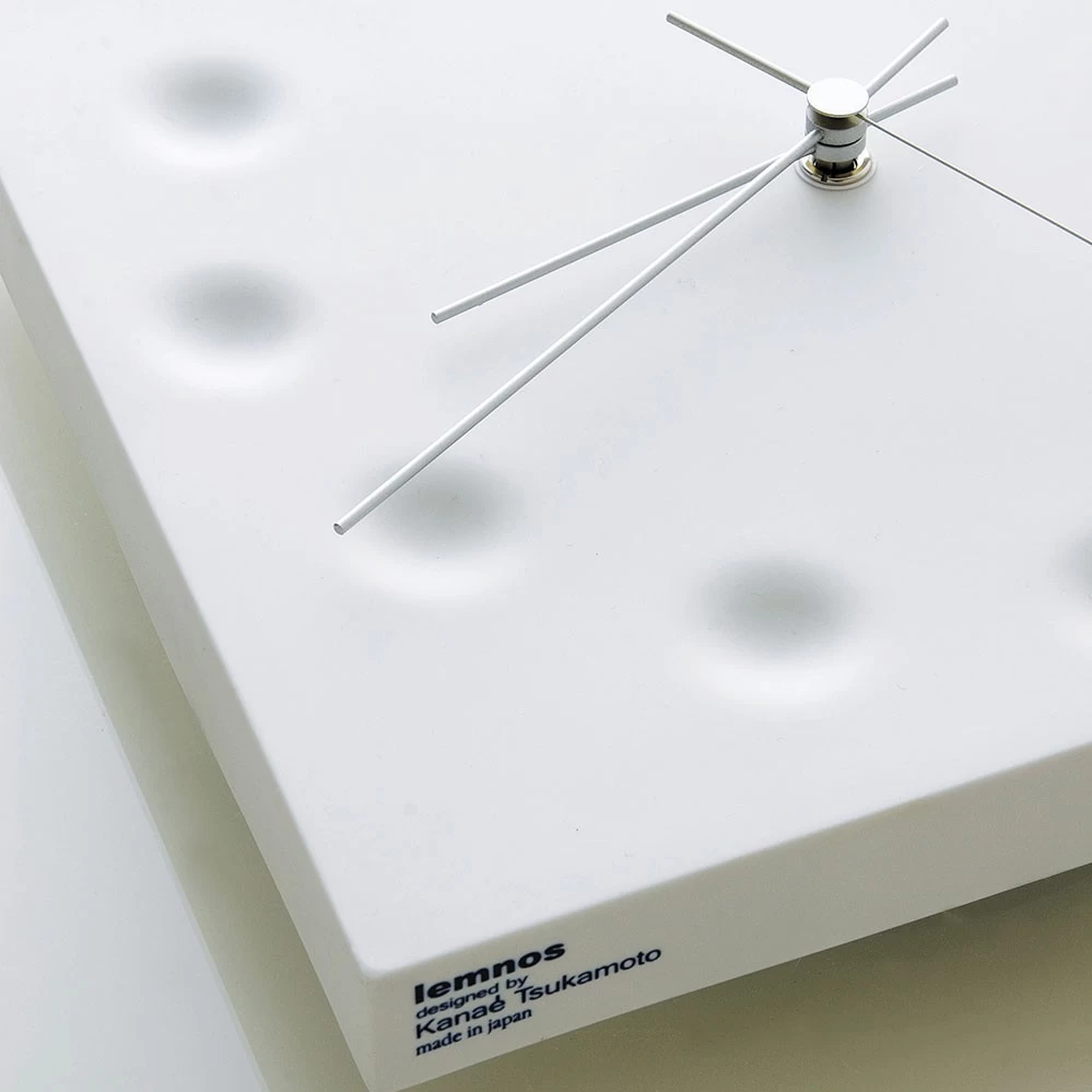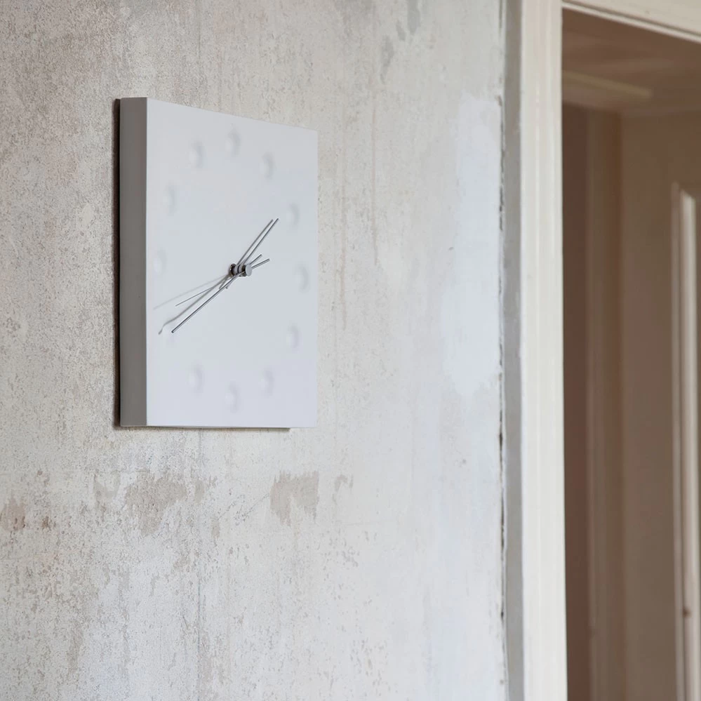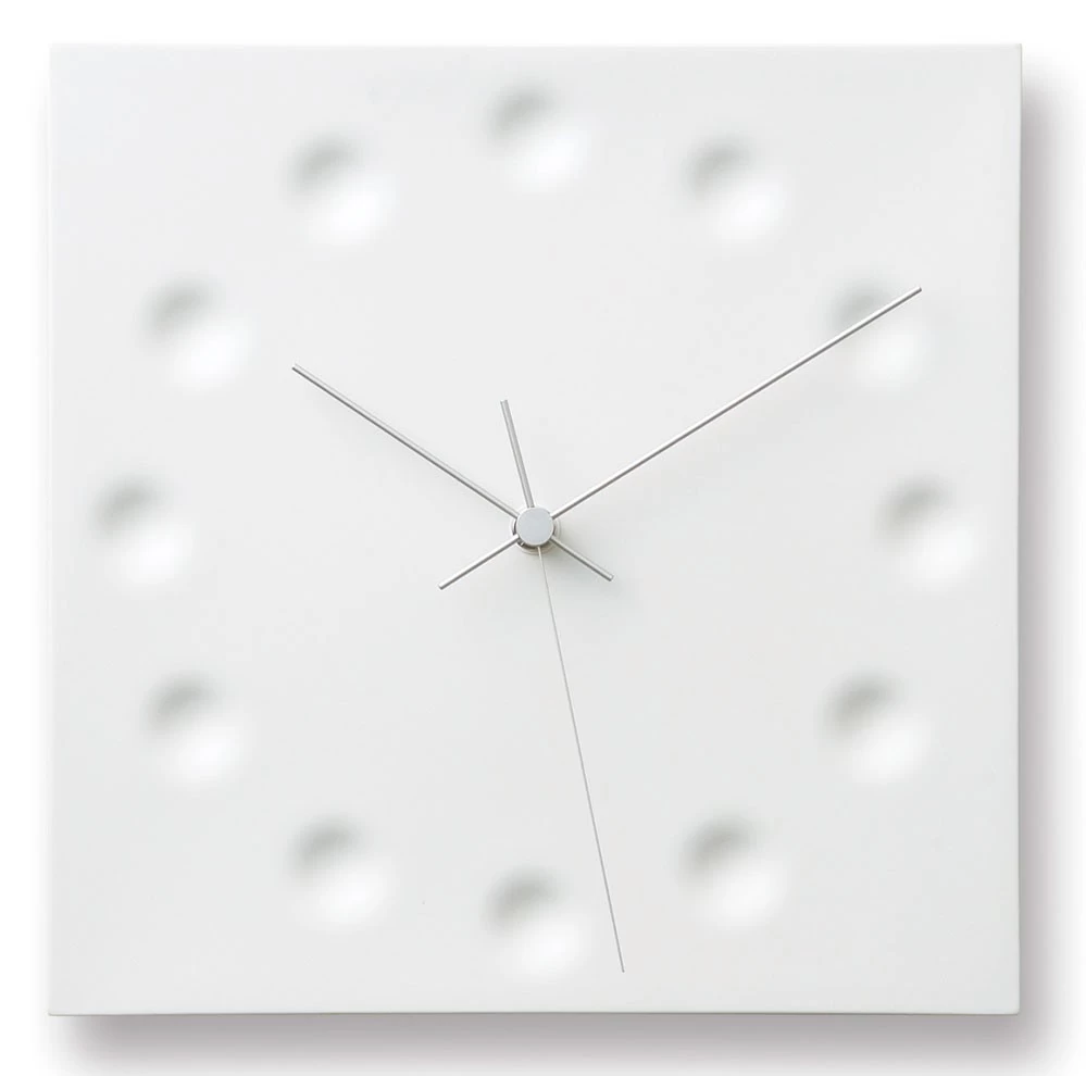 Die elegante Wanduhr Drops Draw The Existence ist ein Entwurf der japanischen Industriedesignerin Kanaé Tsukamoto für Lemnos. Gefertigt wird die quadratische Uhr aus Porzellan.