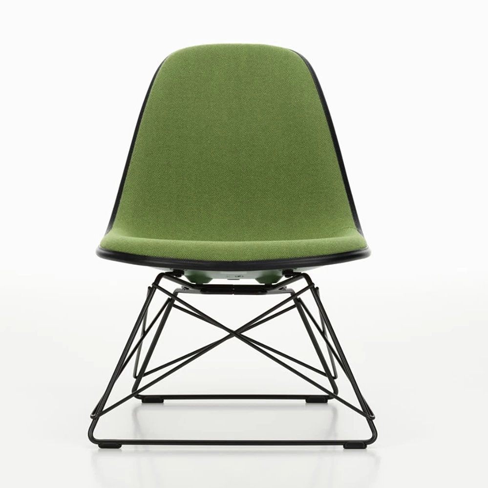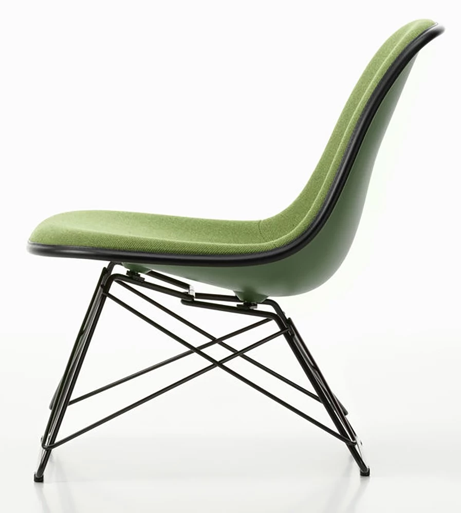 Die gepolsterte Version des kleinen Sessels Plastic Side Chair LSR von Charles und Ray Eames mit dem sogenannten Cat’s Cradle Gestell kombiniert Design mit hohen Sitzkomfort. Das Gestell ist wahlweise verchromt oder schwarz und weiß möglich.