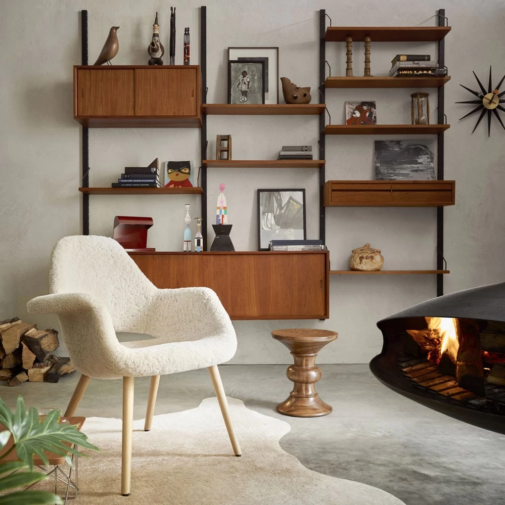 Die archaisch wirkenden Eames Stools greifen die minimalistischen Ursprünge des Sitzens auf. Charles und Ray Eames nannten die massiven Nussbaum-Hocker selbst Perchers, da sie auch als kleine Tische oder als Sitzgelegenheiten für kurze Zeit verwendet werden konnten. In ihrem Haus in Los Angeles fanden die Hocker oft Verwendung. Es gibt die Eames Stools in drei verschiedenen Ausführungen, die sich in der Form des Mittelteils leicht unterscheiden. Gedrechselt aus massiven Nussbaum sind die Hocker trotz ihrer Sitzmulde als kleiner Ablagetisch gedacht. So eignen sie sich ideal für den Eames Lounge Chair.