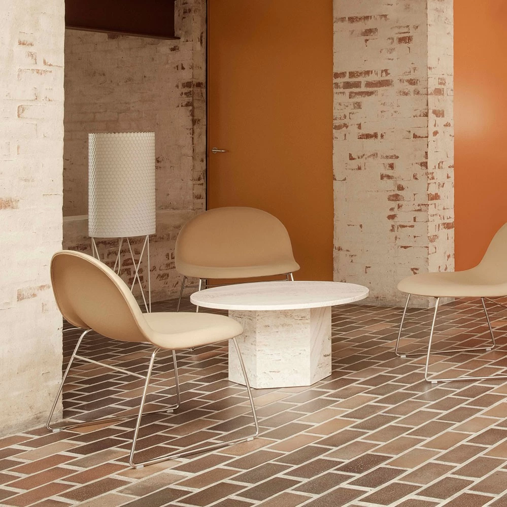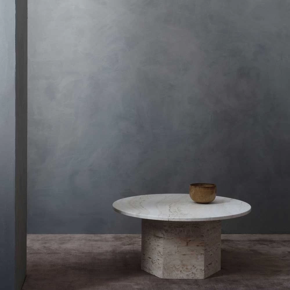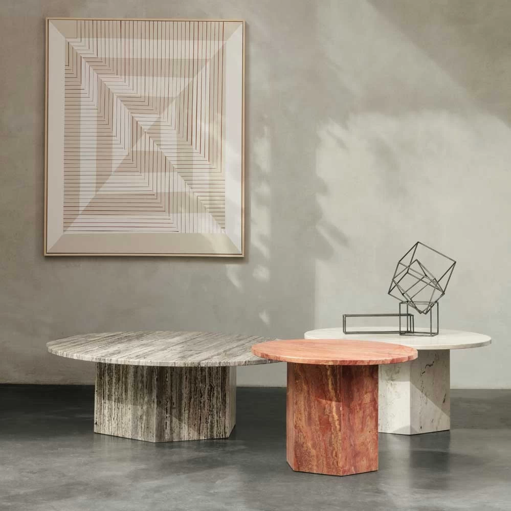 Ende 2019 entwarfen GamFratesi für Gubi die Tische der Epic Serie. Dazu nutzten sie eines unserer absoluten Lieblingsmaterialen: Travertinstein. Dieser teilweise etwas poröse Kalkstein überzeugt durch seine schöne Oberflächenstruktur und Haptik und ist in unterschiedlichen Farbgebungen von creme bis rot in der Natur vorhanden. Die Epic Serie besteht aus drei Couchtischen und einen Esstisch, der von der Form fast an antike Monumente erinnert.