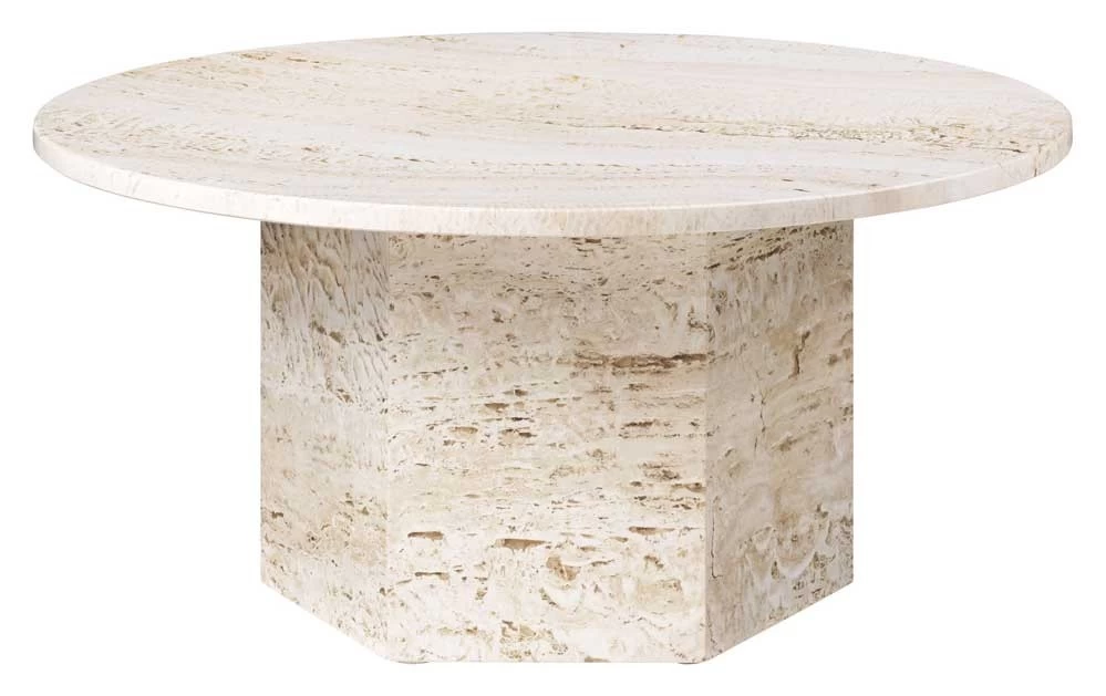 2021 ergänzte Gubi die Epic Tischserie zusätzlich mit Stahltischen, der 80 cm große Couchtisch ist dabei in drei Stahlfarben erhältlich. Der ursprüngliche Entwurf von GamFratesi ist dabei aus dem Jahr 2019, dabei nutzten sie eines unserer absoluten Lieblingsmaterialen: den Travertinstein. Dieser teilweise etwas poröse Kalkstein überzeugt durch seine schöne Oberflächenstruktur und Haptik und ist in unterschiedlichen Farbgebungen von creme bis rot in der Natur vorhanden. Die Epic Serie besteht aus drei Couchtischen und einen Esstisch, der von der Form fast an antike Monumente erinnert.