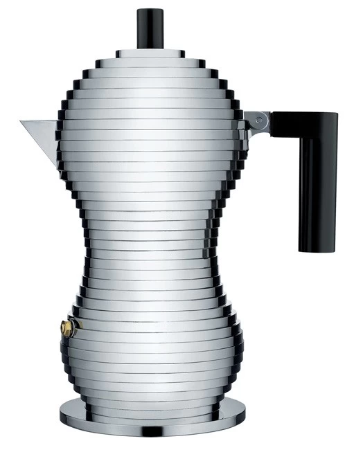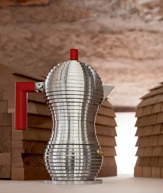 Mit dem Entwurf der Expressokochers Pulcina schuf Michele de Lucchi eines der schönsten, skulpturalen Designobjekte des Jahres 2015. Hergestellt von Alessi aus glänzendem Gußaluminium, ist die Expressomaschine mit ihrer ikonischen Formgebung nicht nur optisch ein Genuss. Der Innenkörper unterbricht den Fluss des Kaffees rechtzeitig, um so einen bitteren Nachgeschmack zu vermeiden. Erhältlich wahlweise mit schwarzem oder rotem Griff (die von Michele De Lucchi präferierte Version ist die rote Variante).
