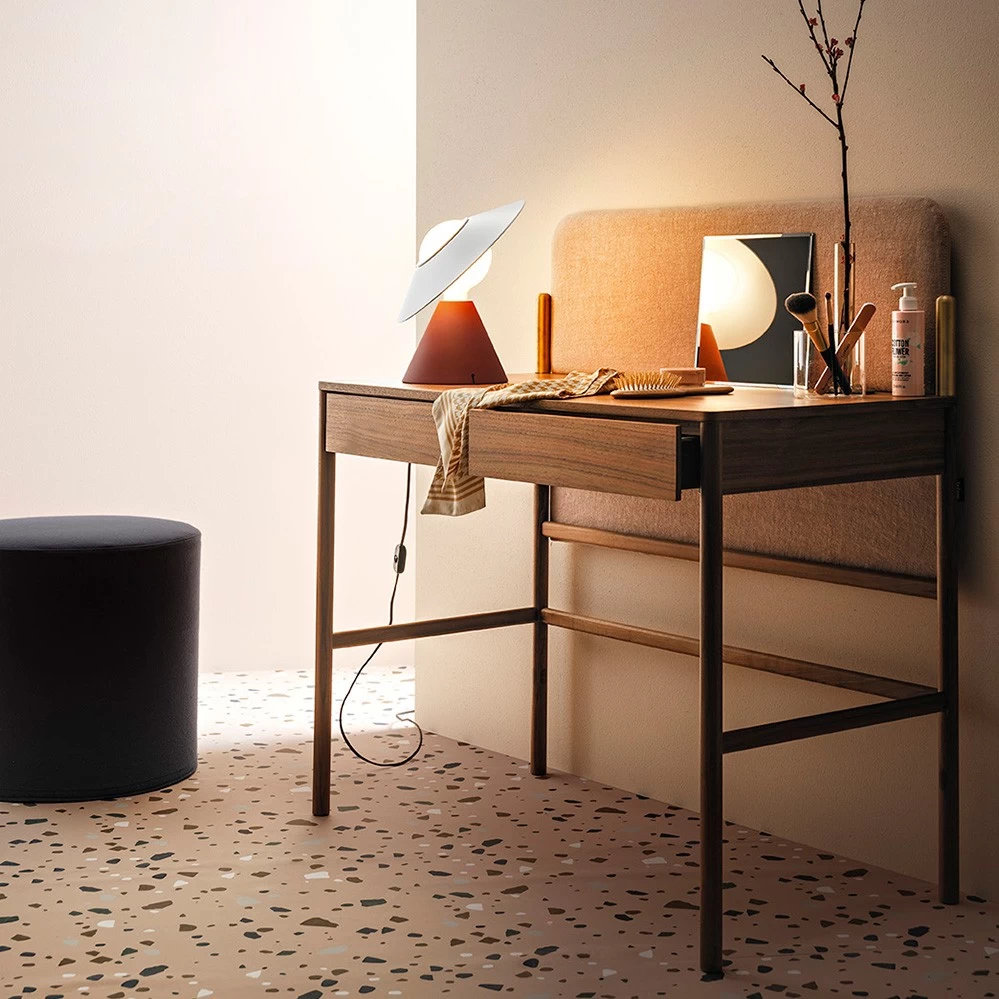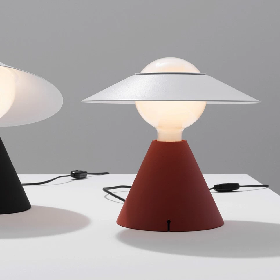 Das Licht der Fante Tischleuchte aus dem Jahr 1978 ist am beweglichen Reflektor am Kopf des Leuchtmittels, das einem Hut mit breiter Krempe ähnelt, leicht auszurichten. Die Kippfreiheit erlaubt, gleichzeitig sowohl das Licht nach unten als auch nach oben zu steuern. Der konische Sockel, weich und angenehm anzufassen, vervollständigt das perfekt proportionierte Design.
