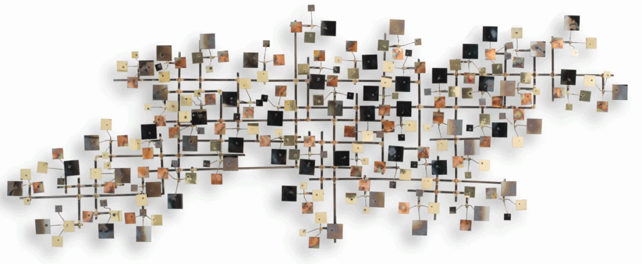 Die 130 cm breite Wandskulptur Firmament von Curtis Jere (oder C. Jeré) ist eine Kombination von Chrom- und Kupferelementen, die bei der Verarbeitung geflammt wurden. Gedacht ist es, mehrere der Skulpturen nebeneinander zu hängen.