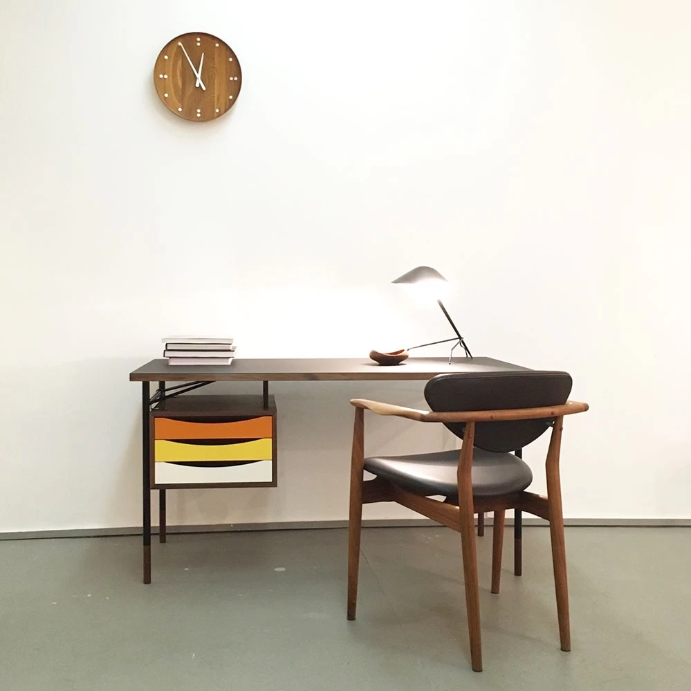 Für das Hauptquartier der Vereinten Nationen in New York entwarf Finn Juhl im Jahr 1950 diese Teak-Wanduhr, die 2015 von Architect Made als Edition aufgelegt wurde. In dem unter der Führung von Le Corbusier und Oscar Niemeyer geplanten Gebäude der Vereinten Nationen kamen damals zahlreiche Möbelentwürfe von Finn Juhl (er plante Teile der Inneneinrichtung) zum Einsatz, die dem dänischen Designer einen großen Popularitätsschub brachten. Das Original der Uhr befindet sich heute noch im großen Sitzungssaal des UN Treuhandrates rechts an der Wand (siehe Wikipedia) und letzte Abbildung.