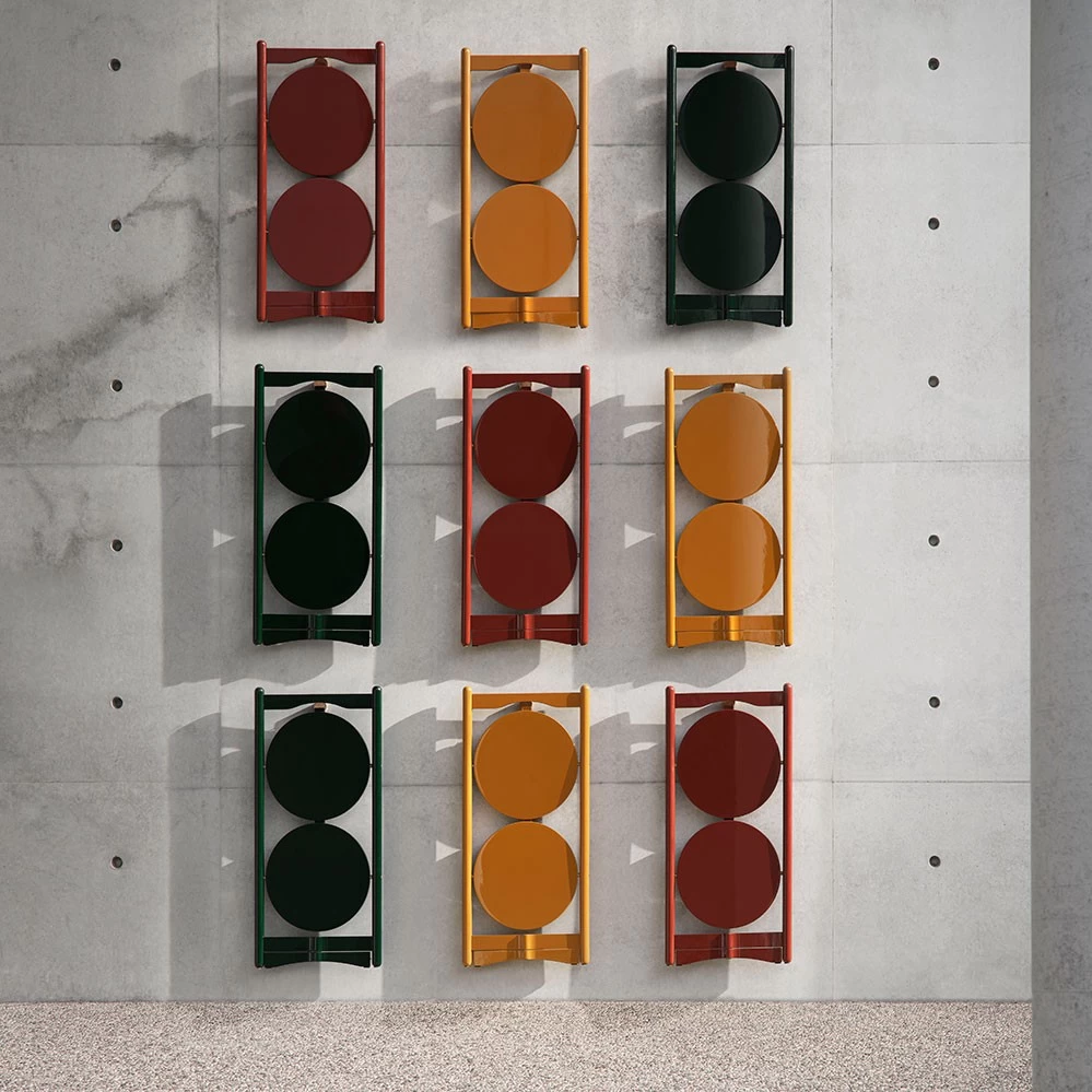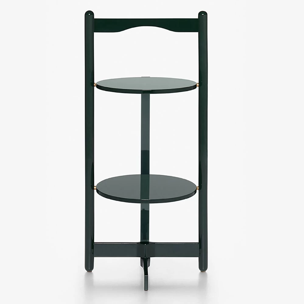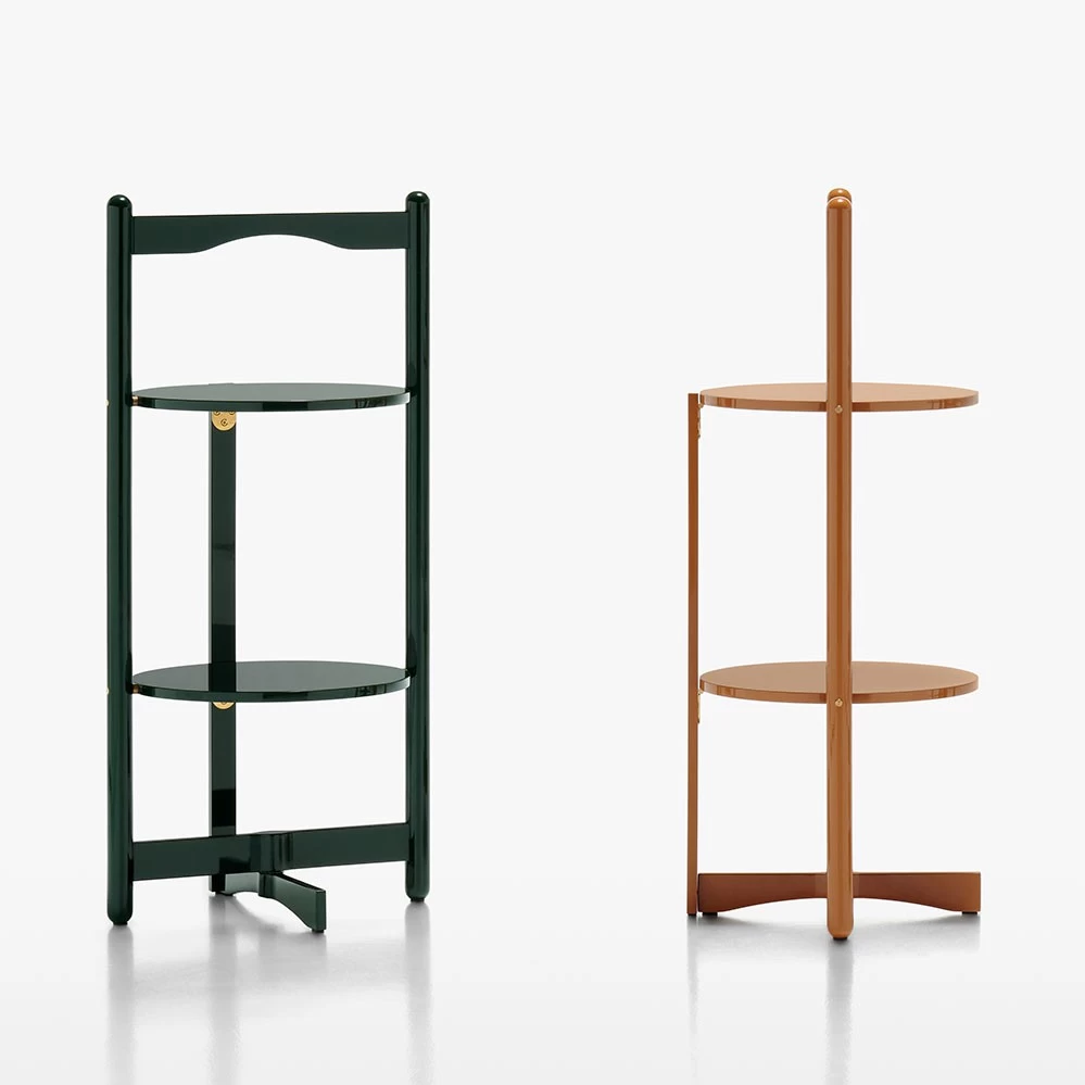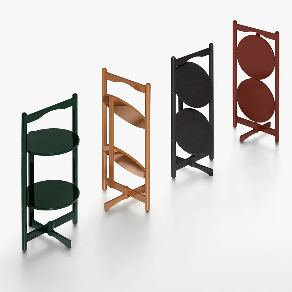 Der faltbare Beistelltisch oder Serviertisch Florian ist ein späterer Entwurf von Vico Magistretti aus dem Jahr 1989. Der zweistufige Klapptisch verfügt über eine Tragstruktur aus Massivholz, diese wird auf dem zentralen Fuß nach unten geklappt und ermöglicht so das Aufbewahren ohne viel Raum einzunehmen oder das Aufhängen an der Wand. Erhältlich ist der Tisch bei Acerbis glanzlackiert in Dunkelgrün, Senfgelb, Ziegelrot oder in matt schwarzer Esche. Kontrastierende Scharniere und Stifte aus Messing unterstreichen das Design.