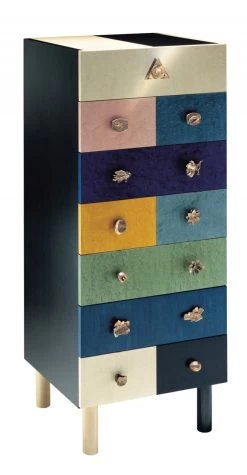 1990 entwarf Alik Cavaliere die Kommode Genesis und spielte dabei mit den Farben – jede der zehn Schubladen ist aus einem andersfarbigen Wurzelholzfurnier. Im Kontrast stehen dazu die Türgriffe aus Bronze, die Darstellungen der Genesis-Schöpfungsgeschichte zeigen. Die Kommode ist Bestandteil der Edizione von Zanotta und entsprechend signiert.