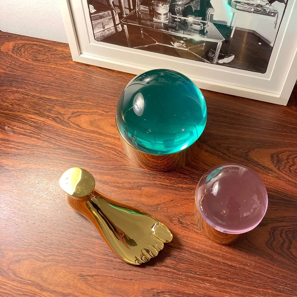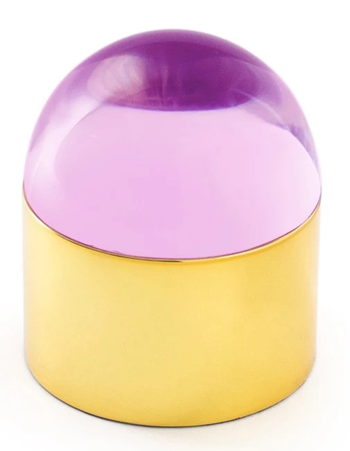 Die kleine Globo Schmuckdose zählt zu einem dreiteiligen Set an Schmuckdosen von Jonathan Adler. Hierbei kombinierte er zwei ungewöhnliche Materialien miteinander – Acrylglas und Messing. Gerade diese Materialkombination und der runde dreidimensionale Deckel mit seiner optischen Verspiegelung erzeugen einen beeindruckenden Effekt. Erhältlich ist die kleine Globo Dose in den beiden zwei Farbvarianten transparent und violett.