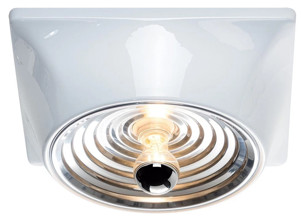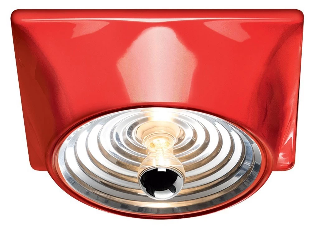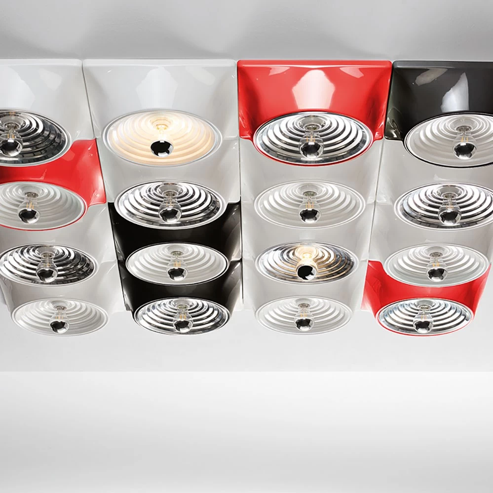 Die „dreidimensionale“ Wand- oder Deckenleuchte Goletta war die erste Kunststoffleuchte von Stilnovo, der Entwurf stammt von Studio Nizzoli Associati aus dem Jahr 1969. Die Form verbindet Quadrat und Kreis, der pyramidenförmige, runde Reflektor aus Aluminium ist innen silber poliert. Alternativ ist der Reflektor bei Stilnovo innen weiß lackiertt erhältlich, siehe unten. Die Leuchte kann wahlweise als Solitär dienen oder in Kombination mehrerer Golettas eine ganze Lichtkomposition erstehen lassen. Der Leuchtenkörper aus Kunstoff garantiert Stabilität, während der Reflektor aus poliertem Aluminium einen Hauch von Eleganz und Raffinesse verleiht.