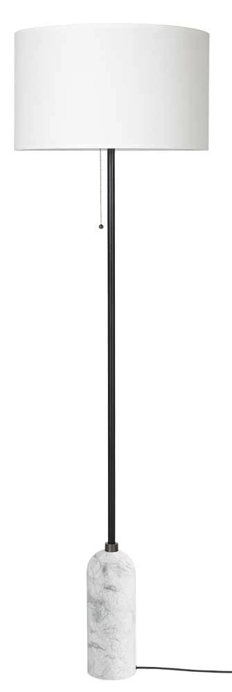 Zur Gubi Gravity Kollektion zählt neben den beiden Tischleuchten auch die Stehleuchte gleichen Namens. Bei der Gravity Stehleuchte im Stil der 1970er Jahre ist der Schirm wahlweise aus weißer Baumwolle oder aus cremefarbigem Canvas. Der zylindrische Fuß ist wahlweise aus Marmor oder in schwarz lackiertem Stahl erhältlich.