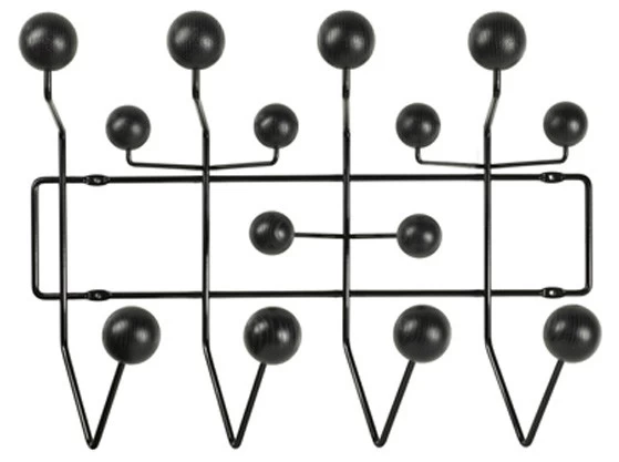 Die berühmte Garderobe Hang it all von Charles Eames ist eine fröhliche Alternative zum gewöhnlichen Kleiderhaken. Der Name drückt bereits aus, was das Eames Ehepaar (die usprüngliche Farbgebung basiert auf einem Farbkonzept von Ray Eames) mit diesem Entwurf von 1953 bezwecken wollte – die bunten Holzkugeln der Hang it All sollte Kinder ermuntern, ihre Kleidung daran aufzuhängen.