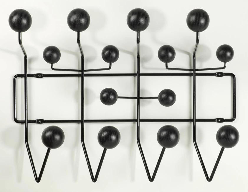 2015 legte Vitra eine neue Farbvariante der Garderobe Hang it all von Charles Eames auf. Diese Version ist ganz in schwarz gehalten, was der Garderobe ein gewisses Understatement verleiht. Im Unterschied zu früheren Hang it all Versionen, bei denen die Kugeln zwar ebenfalls aus Holz, aber lackiert waren, treten hier bei den Kugeln die Holzmaserungen deutlich hervor. Das verleiht dem Designklassiker ein fast handwerkliches Flair.