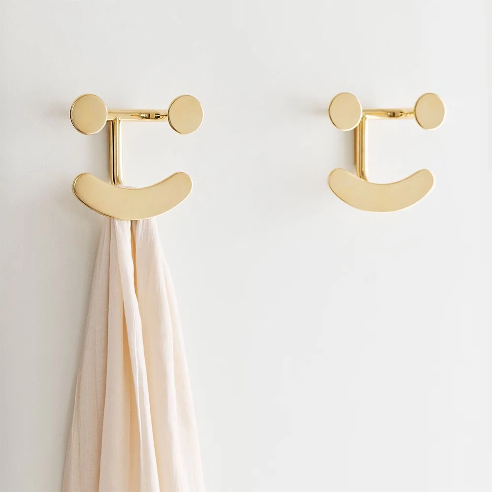 Die kleine Wandgarderobe Happy Hook von Jaime Hayon zeigt ein abstraktes, fröhliches Gesicht in Form eines Piktogramms, an dem man zum Beispiel einen Mantel, Jacke oder eine Küchenschürze aufhängen kann. Erhältlich ist Happy Hook in drei Farben und in unbehandeltem Messing